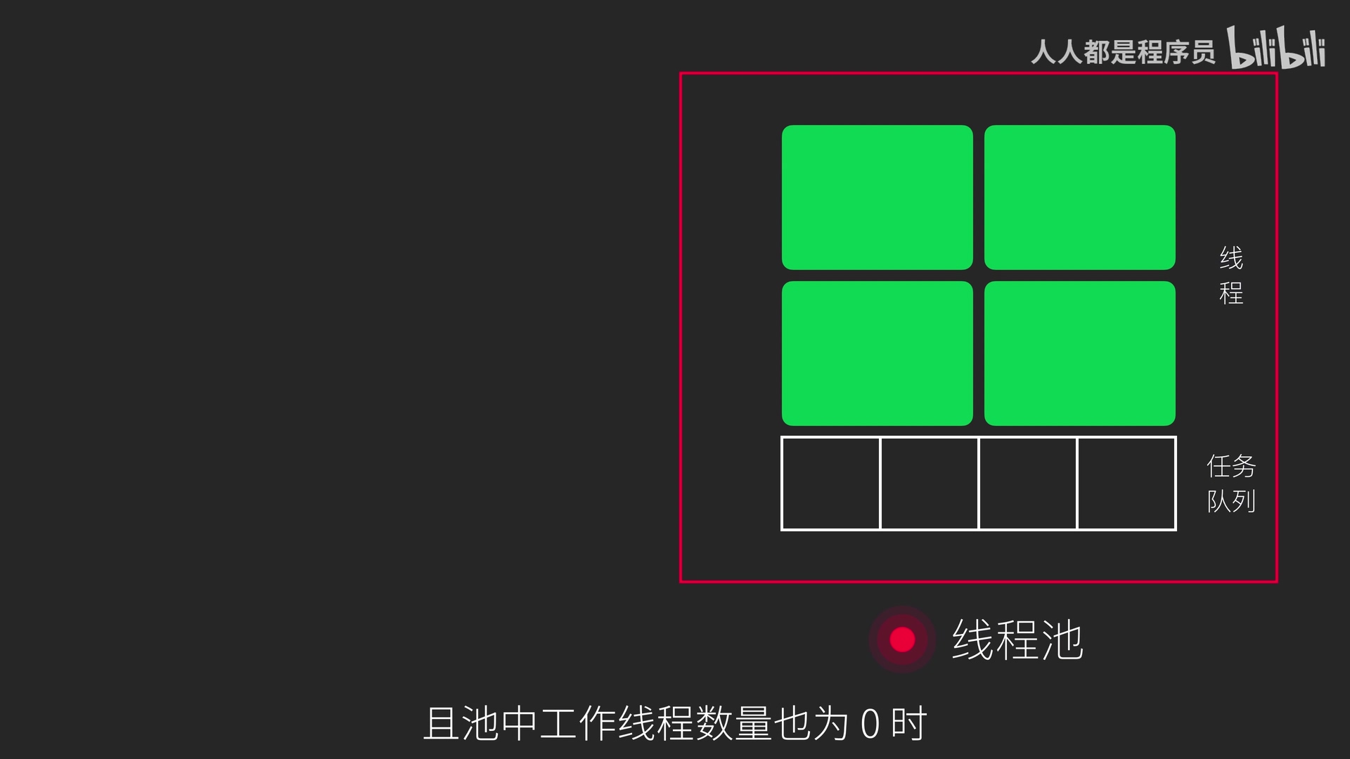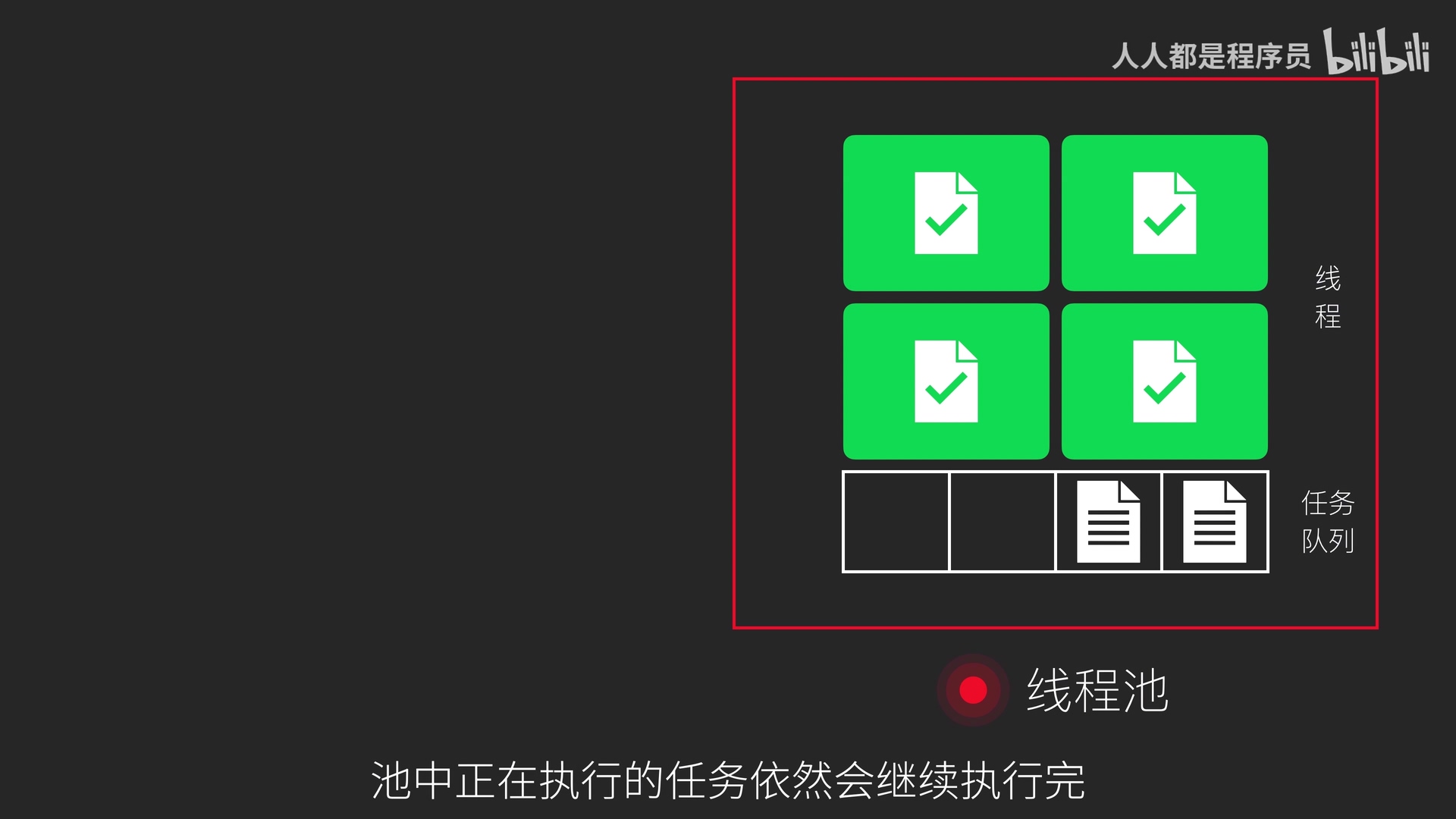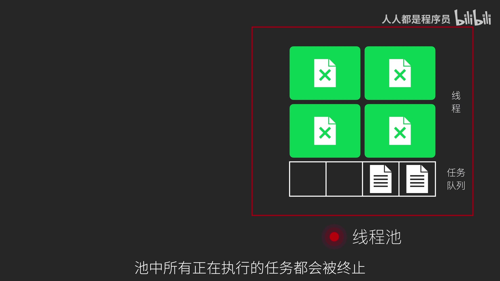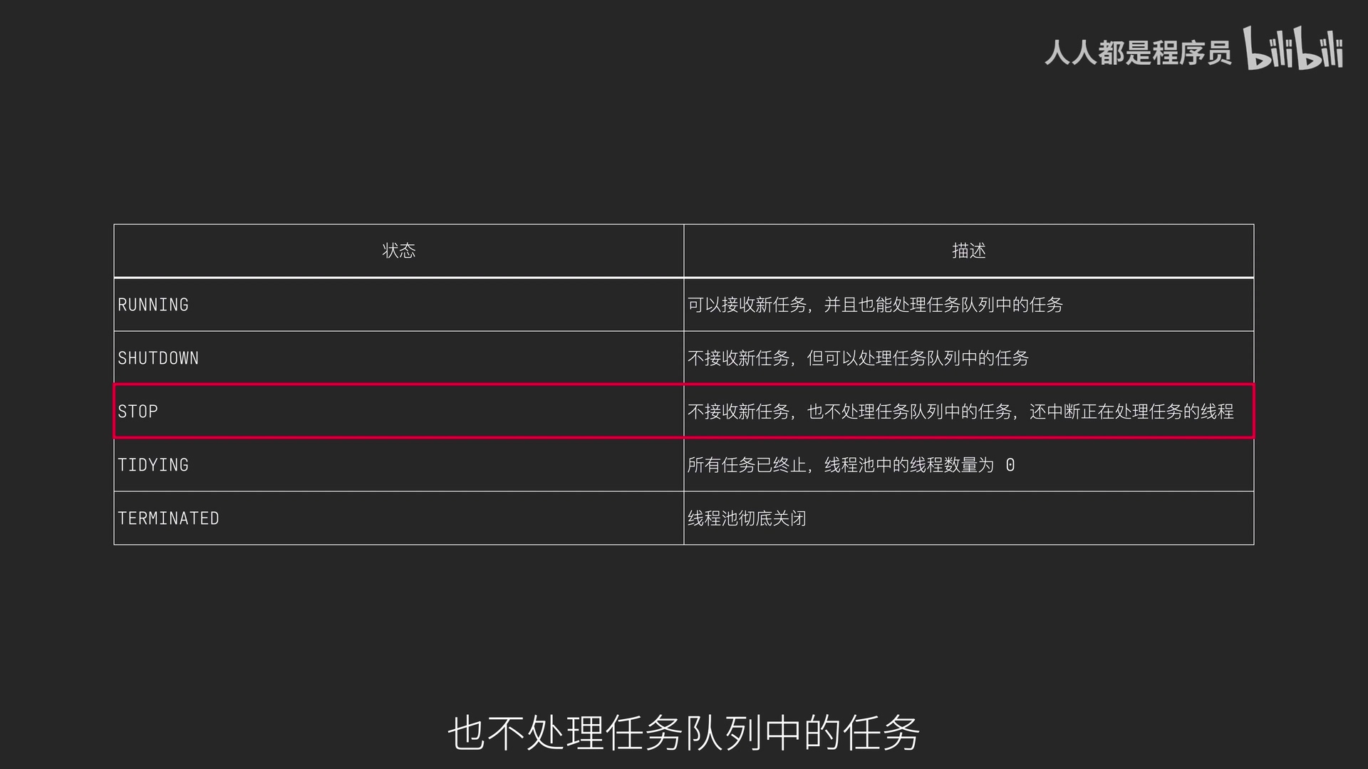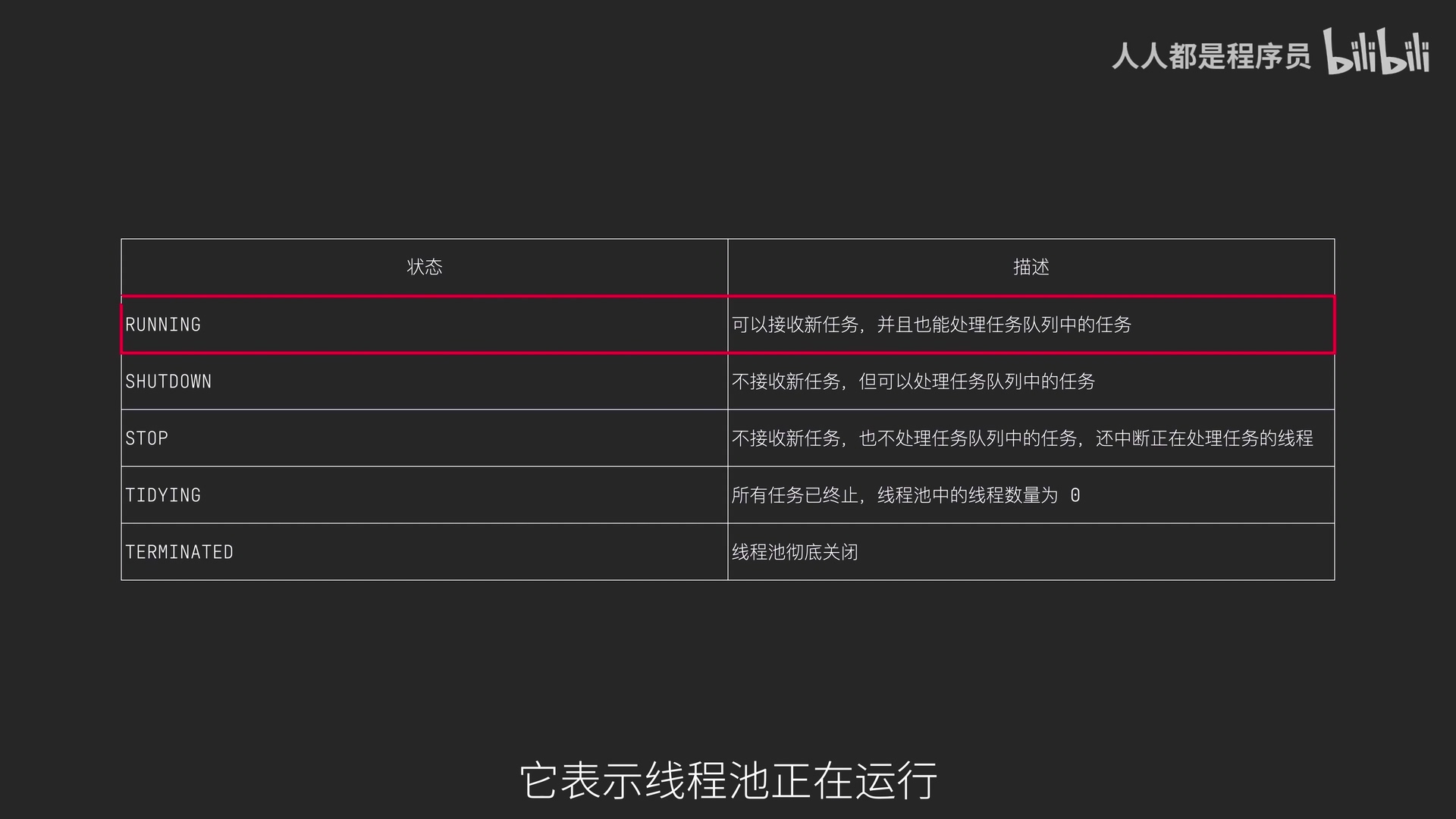 线程池在其生命周期中会经历多种状态,这些状态被定义在threadPoolExecutor中,一共有5种。这些状态所对应的描述如图所示,下面几小节将介绍这些状态。首先来看第一个状态,running,他表示线程池正在运行,可以接受新任务,并且也能处理任务队列中的任务,下面动画演示running状态,这是一个正在运行的线程池。其中有4个正在执行任务的线程,任务队列中还有2个未执行的任务,队列还有空位,我们可以继续向线程池中提交新任务,如果池中没有空闲的线程,那么新任务将会被放入任务队列中,当线程执行完任务时,他们会从任务对应中获取任务,继续执行,直到所有任务全部执行完毕,看完running状态,再来看下一个状态。 shoudown表示线程值准备关闭,不接受新任务,但可以处理任务队列中的任务。下面动画演示shoudown状态,这是一个正在运行的线程池,当我们调用shoudown方法时,现成池的状态就由running变为shoudown,所有提交的任务都会被拒绝,但是池中正在执行的任务依然会继续执行完,这也包括任务队列中还未执行的任务,当队列中的任务都执行完时,线程池状态会由shoudown变为tidying。看完shoudown状态,再来看下一个状态,stop。他表示线程池准备关闭,不接受新任务,也不处理任务对接中的任务,还中断正在执行任务的线程。下面动画演示 stop状态,这是一个正在运行的线程池,当我们调用shoudown方法时,线程池状态由running变为stop,所有提交的先入一律都会被拒绝,而且池中所有正在执行的任务都会被终止。 不仅如此,任务队列中的任务还会返回给调用者,调用者拿到返回的任务以后可以继续执行完,他们现在可以看到线程池变为了一座空线程,下一步就是将这座空城清理掉,shoudown与stop都是在为关闭线程池做准备工作,下一个状态tidying则是线程池正在关闭的状态,此时所有任务已终止,线程池中的线程数量为0。下面动画演示tidying状态,当所有任务都已终止,且时钟工作建成数量也为零时,状态由shoudown或stop变为tidying,此刻的状态表示收尾工作已完成。再来看看最后一个状态,termineted的。他表示线程池彻底关闭,下面动画演示termineted的状态,在收尾工作完成以后,最后调用 termineted的方法彻底将限线程关闭。 至此我们看到了线程池每个状态的变化过程,限制池生命周期也可以画出来了,线程池最初的状态是running,此时线程池正在运行,调用shoudown方法以后状态由running变为shoudown,此时线程值准备关闭,让线程池由正在运行变为准备关闭。还有一种方式,那就是调用shoudownnow方法,状态由running变为stop,在准备工作做完以后就可以开始清理工作了,状态由shoudown变为tidying,需要任务队列为空,工作线程数量为0,也就是要执行完其中所有任务,包括任务队列中的任务状态,由stop变为tidying,只需工作线程数量为0,任务队列中的任务已经返回给调用者了,不需要清空任务队列,最后就用 termineted方法即可让状态由tidying变为termineted,此时的线程池已经彻底完毕。 最后总结一下本节内容,本节介绍了线程池状态及生命周期各状态代表的意思,这里就不再赘述了。另外线程池生命周期如图所示,大家如果有需要的话可以截屏保存下来,这些内容在面试中经常会被问到。