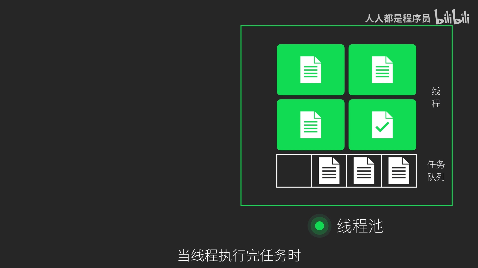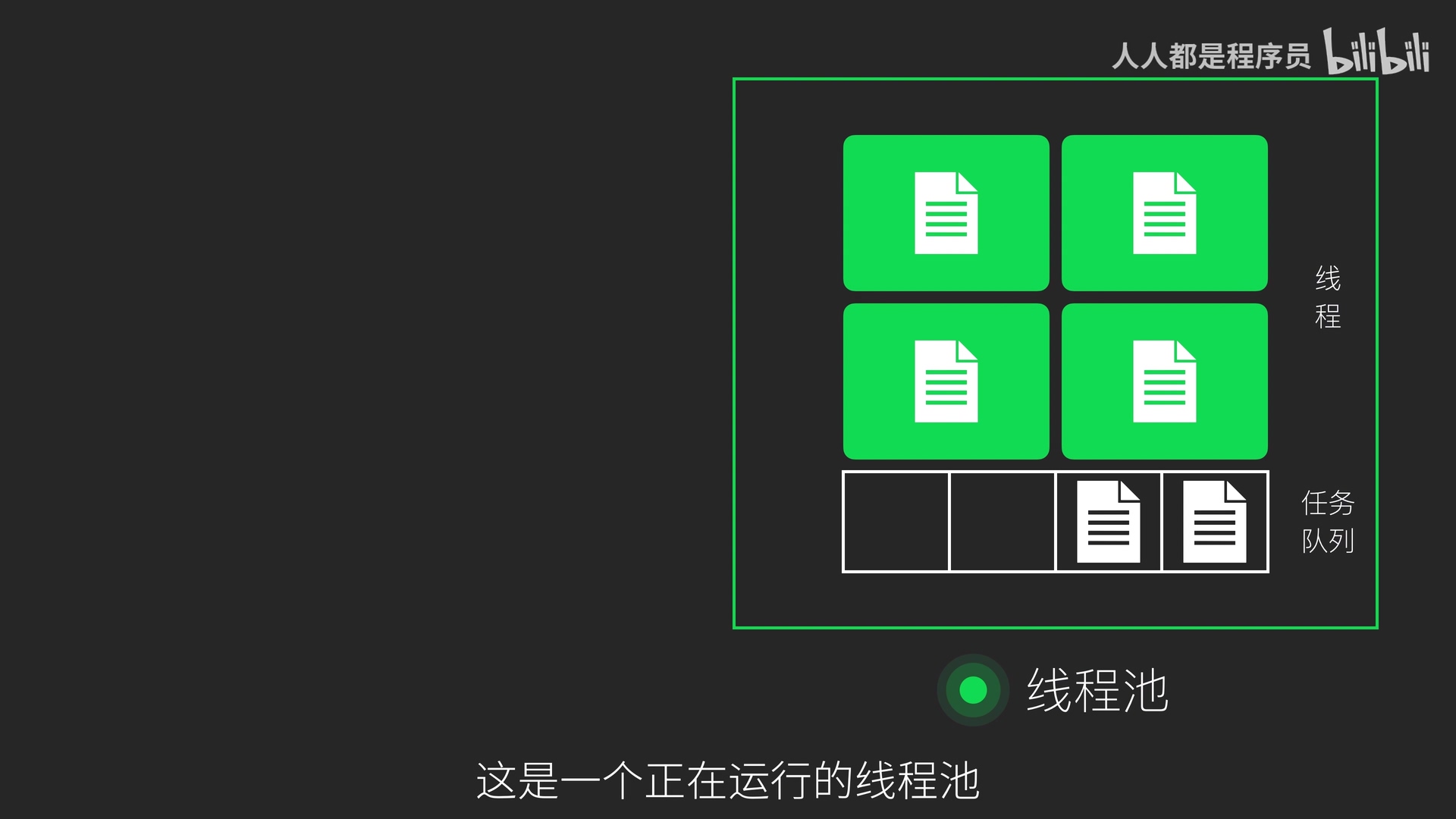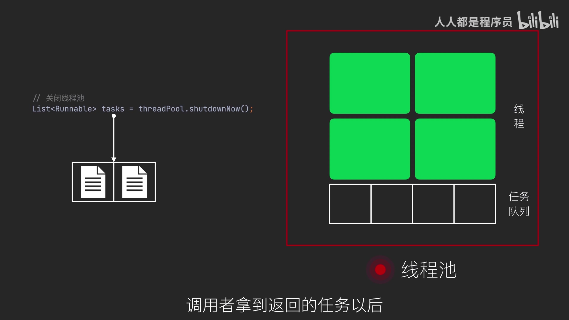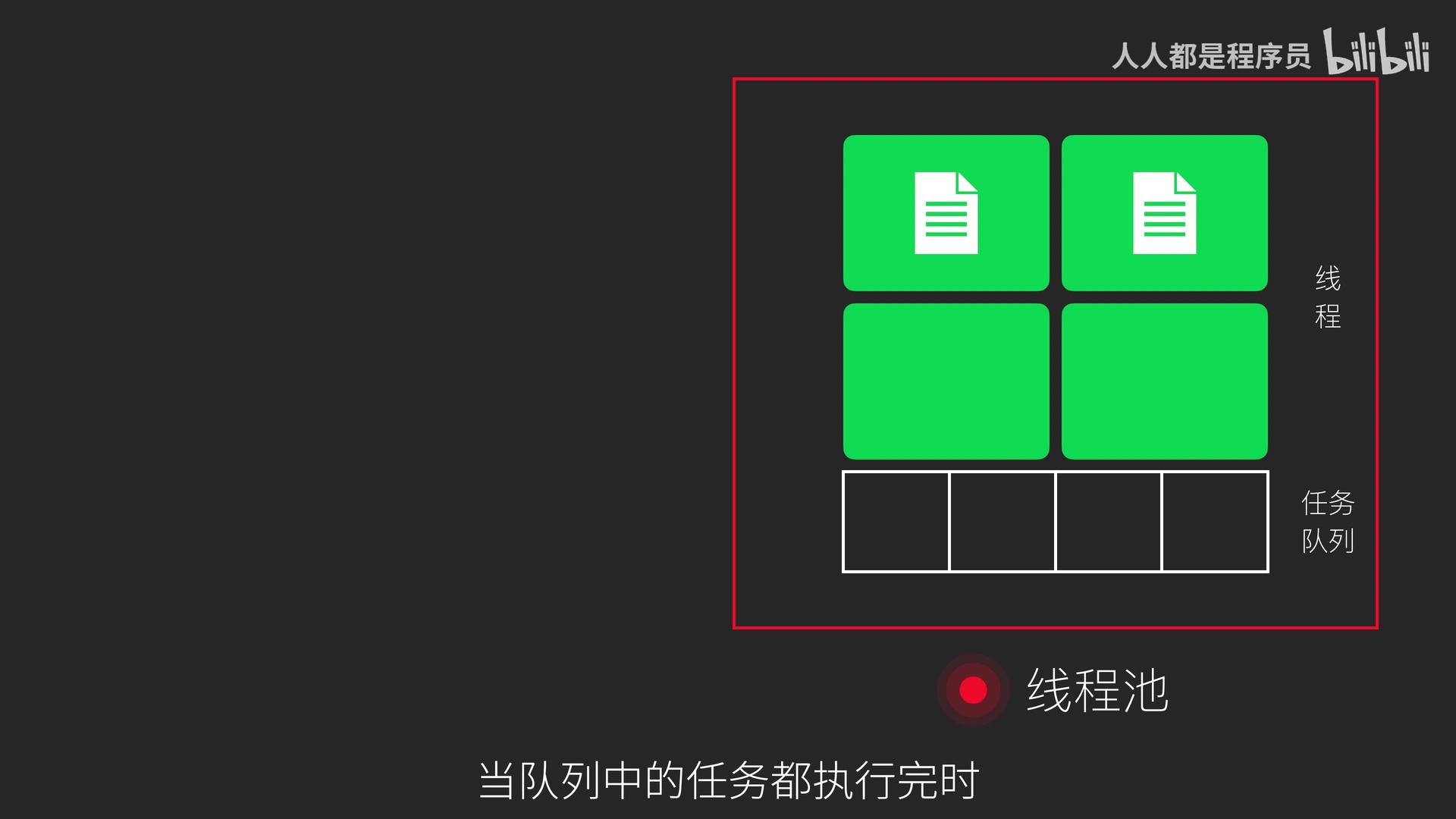 线程池在其生命周期中会经历多种状态,这些状态被定义在threadPoolExecutor中,一共有5种。这些状态所对应的描述如图所示,下面几小节将介绍这些状态。首先来看第一个状态,running,他表示线程池正在运行,可以接受新任务,并且也能处理任务队列中的任务,下面动画演示running状态,这是一个正在运行的线程池。其中有4个正在执行任务的线程,任务队列中还有2个未执行的任务,队列还有空位,我们可以继续向线程池中提交新任务,如果池中没有空闲的线程,那么新任务将会被放入任务队列中,当线程执行完任务时,他们会从任务对应中获取任务,继续执行,直到所有任务全部执行完毕,看完running状态,再来看下一个状态。 shoudown表示线程值准备关闭,不接受新任务,但可以处理任务队列中的任务。下面动画演示shoudown状态,这是一个正在运行的线程池,当我们调用shoudown方法时,现成池的状态就由running变为shoudown,所有提交的任务都会被拒绝,但是池中正在执行的任务依然会继续执行完,这也包括任务队列中还未执行的任务,当队列中的任务都执行完时,线程池状态会由shoudown变为tidying。看完shoudown状态,再来看下一个状态,stop。他表示线程池准备关闭,不接受新任务,也不处理任务对接中的任务,还中断正在执行任务的线程。下面动画演示 stop状态,这是一个正在运行的线程池,当我们调用shoudown方法时,线程池状态由running变为stop,所有提交的先入一律都会被拒绝,而且池中所有正在执行的任务都会被终止。 不仅如此,任务队列中的任务还会返回给调用者,调用者拿到返回的任务以后可以继续执行完,他们现在可以看到线程池变为了一座空线程,下一步就是将这座空城清理掉,shoudown与stop都是在为关闭线程池做准备工作,下一个状态tidying则是线程池正在关闭的状态,此时所有任务已终止,线程池中的线程数量为0。下面动画演示tidying状态,当所有任务都已终止,且时钟工作建成数量也为零时,状态由shoudown或stop变为tidying,此刻的状态表示收尾工作已完成。再来看看最后一个状态,termineted的。他表示线程池彻底关闭,下面动画演示termineted的状态,在收尾工作完成以后,最后调用 termineted的方法彻底将限线程关闭。 至此我们看到了线程池每个状态的变化过程,限制池生命周期也可以画出来了,线程池最初的状态是running,此时线程池正在运行,调用shoudown方法以后状态由running变为shoudown,此时线程值准备关闭,让线程池由正在运行变为准备关闭。还有一种方式,那就是调用shoudownnow方法,状态由running变为stop,在准备工作做完以后就可以开始清理工作了,状态由shoudown变为tidying,需要任务队列为空,工作线程数量为0,也就是要执行完其中所有任务,包括任务队列中的任务状态,由stop变为tidying,只需工作线程数量为0,任务队列中的任务已经返回给调用者了,不需要清空任务队列,最后就用 termineted方法即可让状态由tidying变为termineted,此时的线程池已经彻底完毕。 最后总结一下本节内容,本节介绍了线程池状态及生命周期各状态代表的意思,这里就不再赘述了。另外线程池生命周期如图所示,大家如果有需要的话可以截屏保存下来,这些内容在面试中经常会被问到。