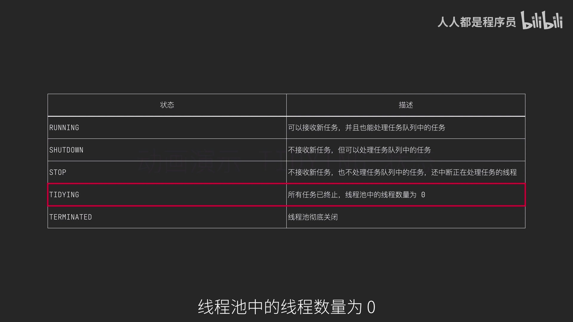 下一个状态tidying则是线程池正在关闭的状态,此时所有任务已终止,线程池中的线程数量为0。