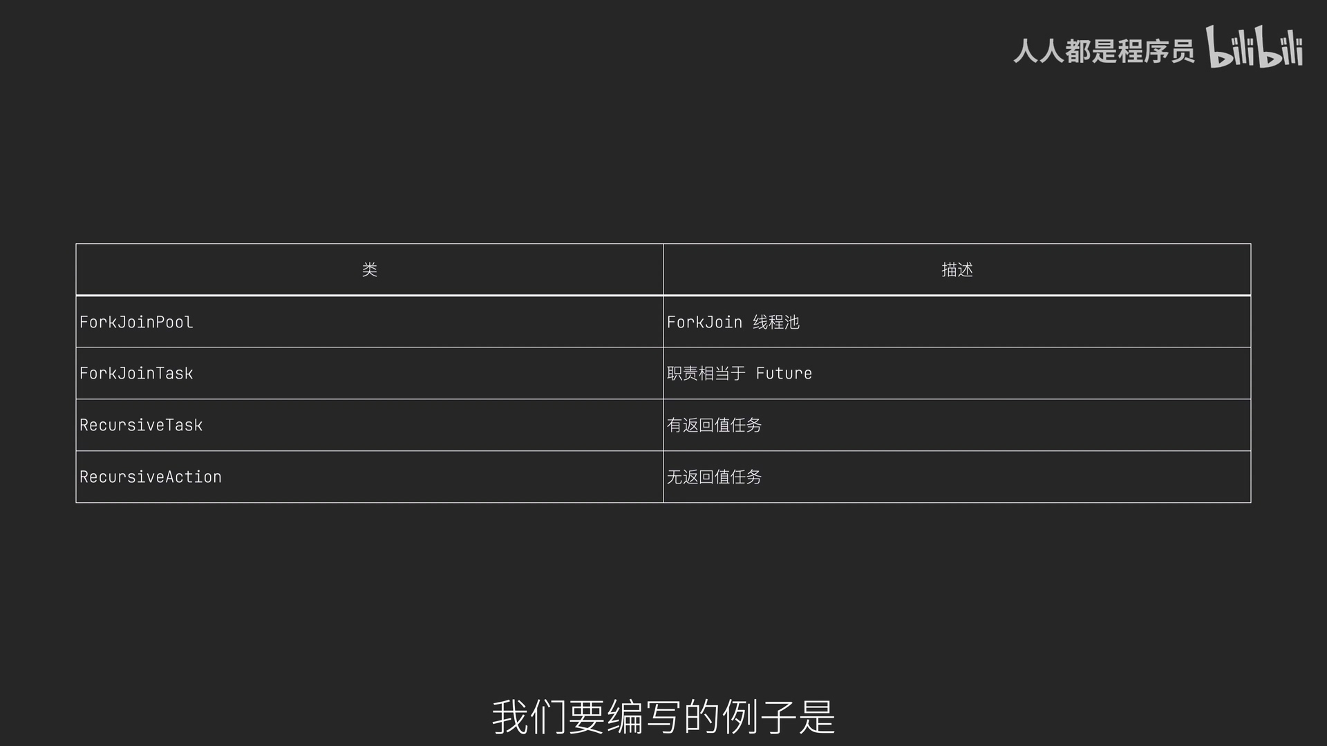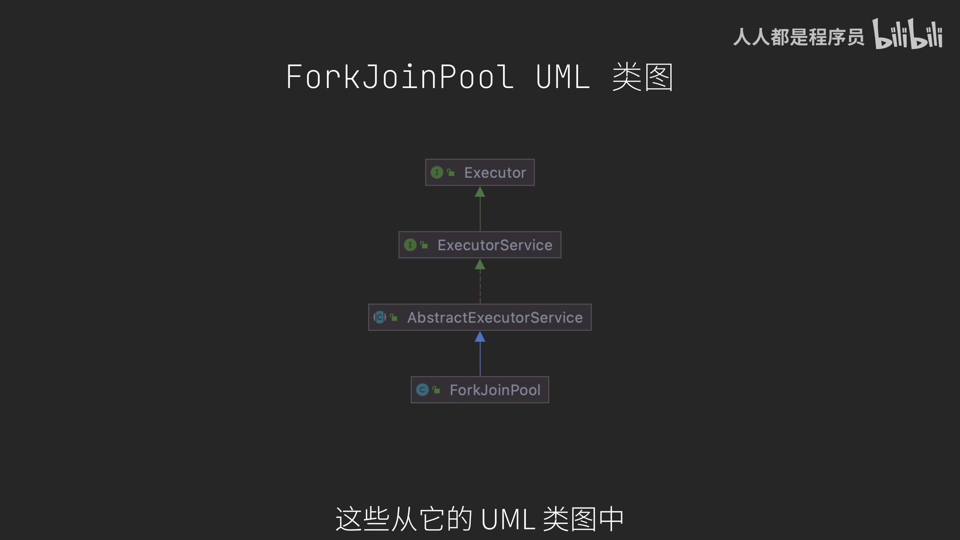 本节来学习如何使用focusjoinPool,更高效的执行大任务。focusjoinPool是一个采用ffocusjoin框架的线程池,它继承自abstractExecutorservice,说明他拥有线程池的基本功能,比如说和一般线程池一样提交任务,关闭线程池等等操作,这些从它的uml类图中也可以看得出来,所以大家按照和之前使用线程池一样使用focusjoinPool就好了。接下来介绍几个与之相关的类。首先是focusjointask,看到类名中带有task,大家一定会想这是不是用来提交给focusjoinPool线程池的任务,他的确可以,但他的职责却相当于future。 任务最终结果是从这里拿,我们真正想要提交任务的话,是通过他的两个子类,一个是RecoursiveTask,他的职责相当于callable,用来执行有返回值任务,另一个是recursiveaction。他的职责相当于runnable,用来执行无返回值任务。下面我们要编写的例子是从1+~100,是一个有返回值任务,所以需要使用RecoursiveTask。在编写代码之前我们先来看一下,从1加~100的ffocusjoin流程图是怎样的,这个可以帮助我们理清编写思路。首先是将从1加到100这个大任务分割成两个子任务,一个子任务是从1+到50,另一个子任务是从51加到100,我们可以看到任务是从中间分割的,所以我们待会可以通过取中间值的方式来分割任务,继续将2个子任务分割成4个子任务,每个子任务计算25个数字之和,还可以继续往下分割,将4个子任务分割成8个子任务。 接下来就是执行这8个子任务,然后合并子任务的结果,直至合并出大任务的结果,至此大任务执行完成,从中间画一道分割线。上部分是在分割任务,下部分是在合并结果,下面编写示例代码,编写一个任务task。继承RecoursiveTask是带泛型的可以指定任务结果的类型,从1加到100的结果是数字类型,所以我们指定泛型为integer,重写compute方法,分割任务和计算的代码都写在这里,定义一个int类型的属性start,用于记录起始值。 从1加到100,1就是起始值,再定义一个int类型的属性end,用于记录结束值,从1+到100 100就是结束值,再定义一个映射类型的属性temp用于记录临界值。什么是临界值?就是一个子任务里面有多少个数字,比如说这里的10表示1个子任务里面有10个数字,你也可以理解成,以10个数组为单位分割1个子任务,重载构造方法用于初始化起始值和结束值。接下来编写compute的方法,我们先来写计算的代码,再来写分割任务的代码,用结束值减去起始值的结果去和临界值比大小,如果小于临界值,说明任务无法再分割,可以开始计算,定义一个int类型的局部变量sum,用于记录计算结果,使用for循环计算任务中的数字之和,接着返回计算结果,至此计算部分的代码写完了,再来编写分割任务部分的代码,首先取中间值,将任务从中间分割,取中间值的方法就是起始值与结束值的和除以二,这样将大任务分割成两个子任务。 其中一个子任务是计算从起始值到中间值之后,调用fork方法将子任务添加至线程池执行。另一个子任务是计算从中间值加一到结束值。为什么要加一?因为中间值已经归前一个子任务中,所以这里要往后移移一位,之后也是调用fork方法将子任务添加至线程池执行,最后调用子任务的join方法合并执行结果,至此compute方法编写完成。整个任务也编写完成。接下来执行该任务,首先将任务串联出来,并指定起始值和结束值,分别为1和100,然后创建focusjoin线程池,接着调用submit方法提交任务,接收方法返回值,再接着,调用get方法获取执行结果,get方法有异常抛出,使用try---catch将其捕获,紧接着输出任务,执行结果写上finally代码块。 在finally代码块中,要用shoudown方法关闭线程池,至此main方法编写完成,整个例子也编写完成,执行程序观察执行结果。从执行结果来看,程序输出5050,计算正确,大家可以试着将结束值写得更大一些,在和普通计算方法做比较,看谁计算的更快。最后总结一下本节内容。本杰介绍采用ffocusjoin框架的线程池,focusjoinPool它的作用及用法,这里就不再赘述了,在实际开发中我经常拿它来执行计算量大的任务,或者是数据量工作量很大的任务,这种将大任务拆分成一个个小任务的做法,它的工作效率远远超过一个线程执行大任务的效率。