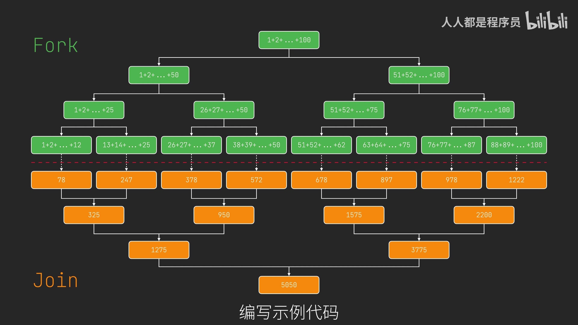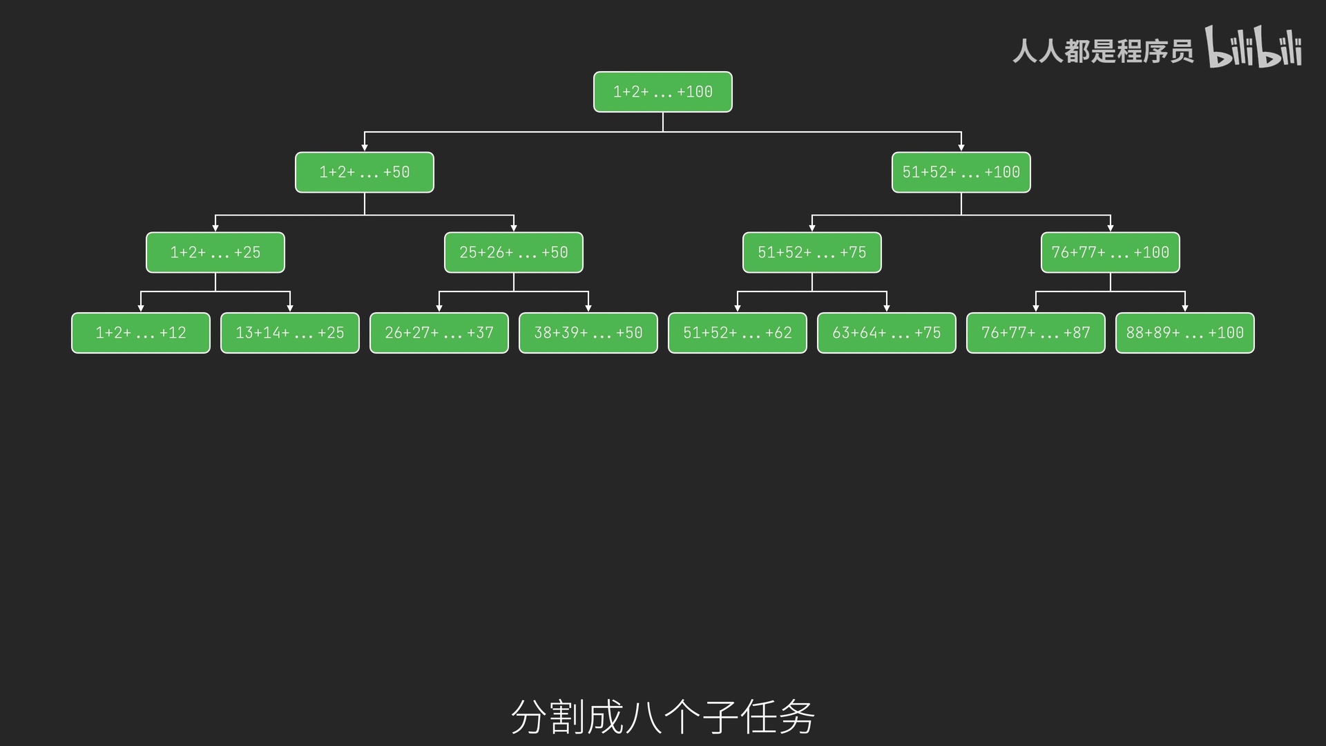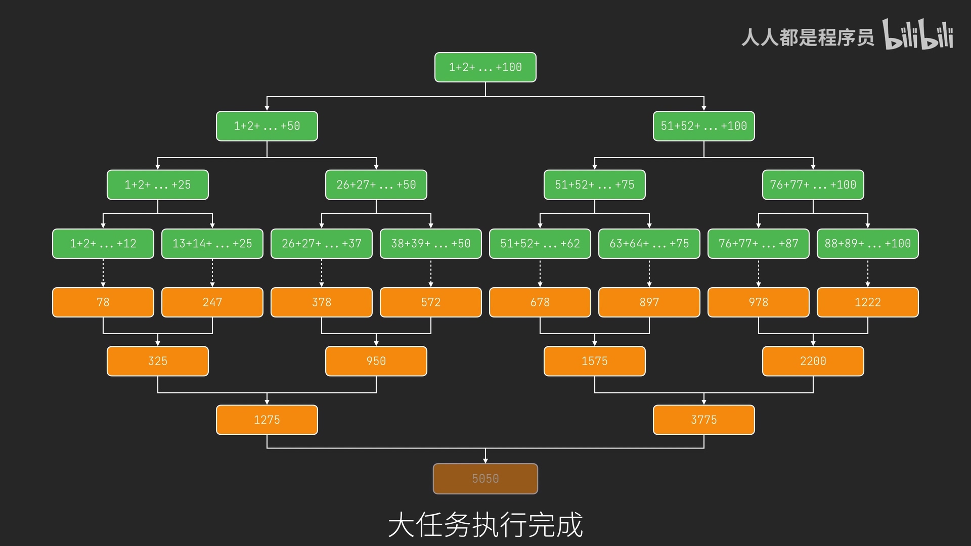 下面我们要编写的例子是从1+~100,是一个有返回值任务,所以需要使用RecoursiveTask。在编写代码之前我们先来看一下,从1加~100的ffocusjoin流程图是怎样的,这个可以帮助我们理清编写思路。首先是将从1加到100这个大任务分割成两个子任务,一个子任务是从1+到50,另一个子任务是从51加到100,我们可以看到任务是从中间分割的,所以我们待会可以通过取中间值的方式来分割任务,继续将2个子任务分割成4个子任务,每个子任务计算25个数字之和,还可以继续往下分割,将4个子任务分割成8个子任务。