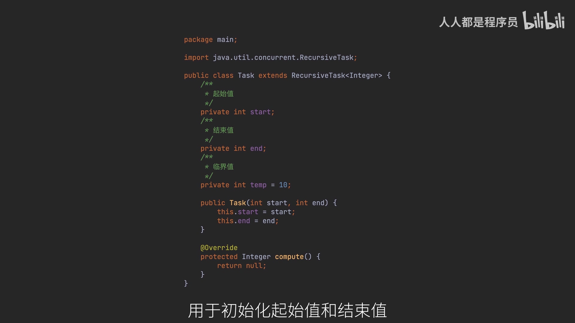 下面编写示例代码,编写一个任务task。继承RecoursiveTask是带泛型的可以指定任务结果的类型,从1加到100的结果是数字类型,所以我们指定泛型为integer,重写compute方法,分割任务和计算的代码都写在这里,定义一个int类型的属性start,用于记录起始值。