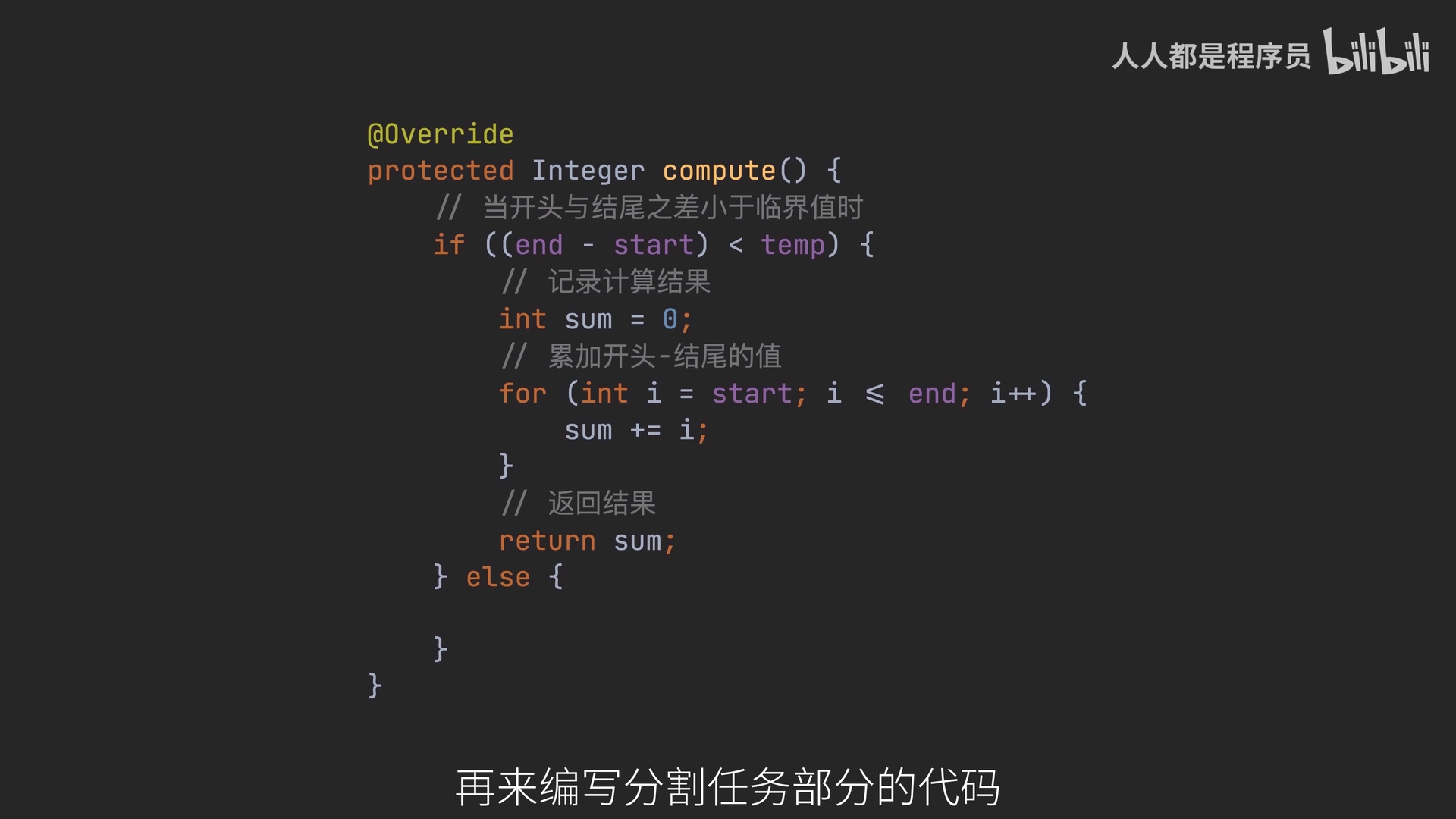 接下来编写compute的方法,我们先来写计算的代码,再来写分割任务的代码,用结束值减去起始值的结果去和临界值比大小,如果小于临界值,说明任务无法再分割,可以开始计算,定义一个int类型的局部变量sum,用于记录计算结果,使用for循环计算任务中的数字之和,接着返回计算结果,至此计算部分的代码写完了,
