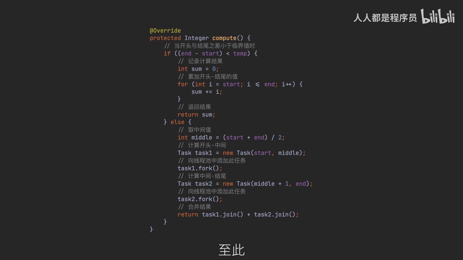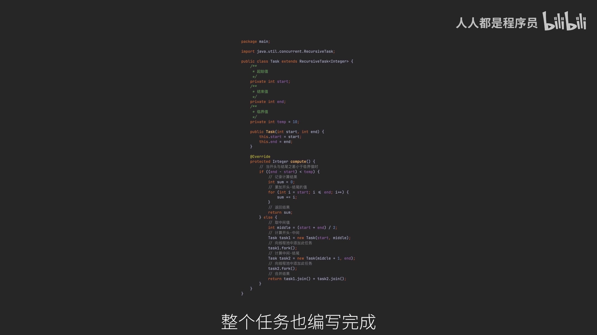 再来编写分割任务部分的代码,首先取中间值,将任务从中间分割,取中间值的方法就是起始值与结束值的和除以二,这样将大任务分割成两个子任务。