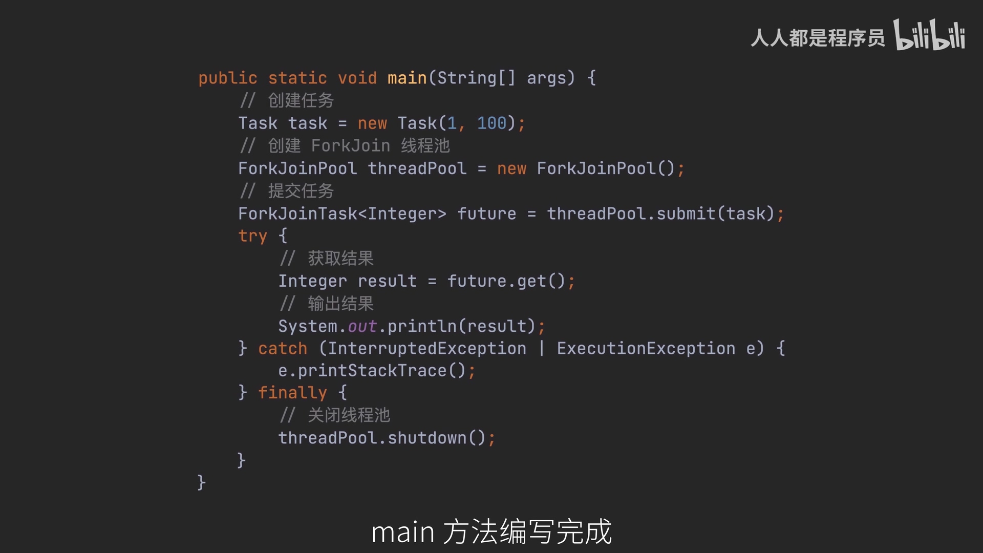其中一个子任务是计算从起始值到中间值之后,调用fork方法将子任务添加至线程池执行。另一个子任务是计算从中间值加一到结束值。为什么要加一?因为中间值已经归前一个子任务中,所以这里要往后移移一位,之后也是调用fork方法将子任务添加至线程池执行,最后调用子任务的join方法合并执行结果,至此compute方法编写完成。整个任务也编写完成。接下来执行该任务,首先将任务串联出来,并指定起始值和结束值,分别为1和100,然后创建focusjoin线程池,接着调用submit方法提交任务,接收方法返回值,再接着,调用get方法获取执行结果,get方法有异常抛出,使用try---catch将其捕获,紧接着输出任务,执行结果写上finally代码块。
