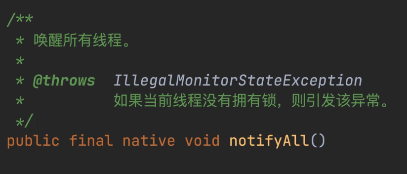 下面我们再来介绍如何唤醒所有等待的线程,使用notifyall方法就可以唤醒所有等待的线程,该方法同样需要被锁对象调用,也是位于object类里面。