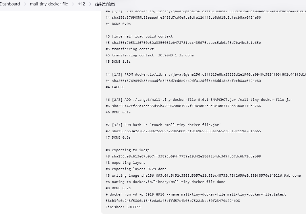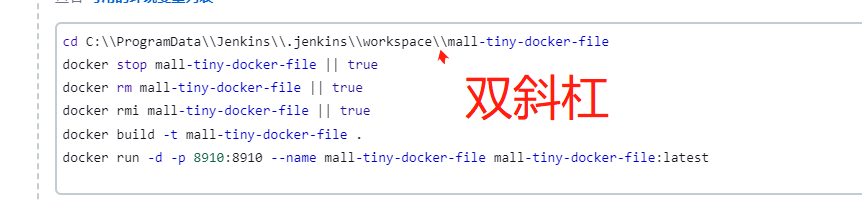 cd C:\\ProgramData\\Jenkins\\.jenkins\\workspace\\mall-tiny-docker-file docker stop mall-tiny-docker-file || true docker rm mall-tiny-docker-file || true docker rmi mall-tiny-docker-file || true docker build -t mall-tiny-docker-file . docker run -d -p 8910:8910 --name mall-tiny-docker-file mall-tiny-docker-file:latest