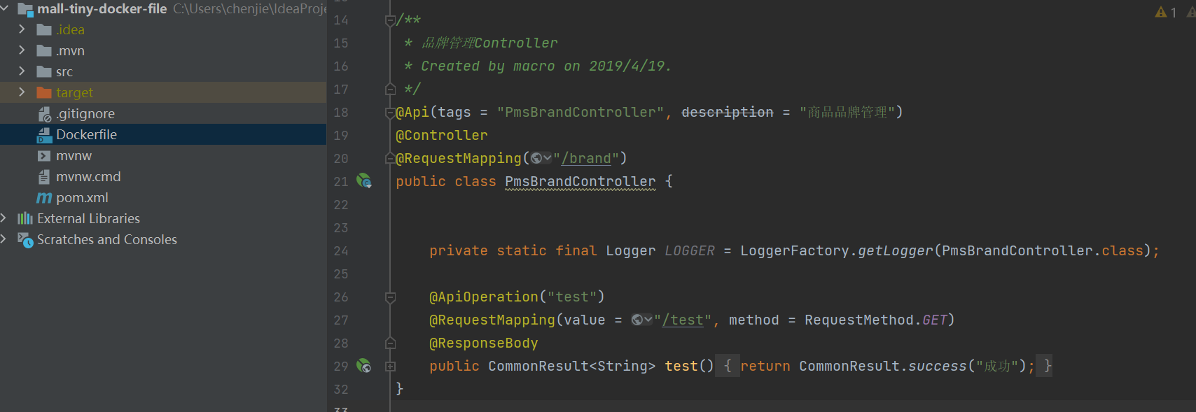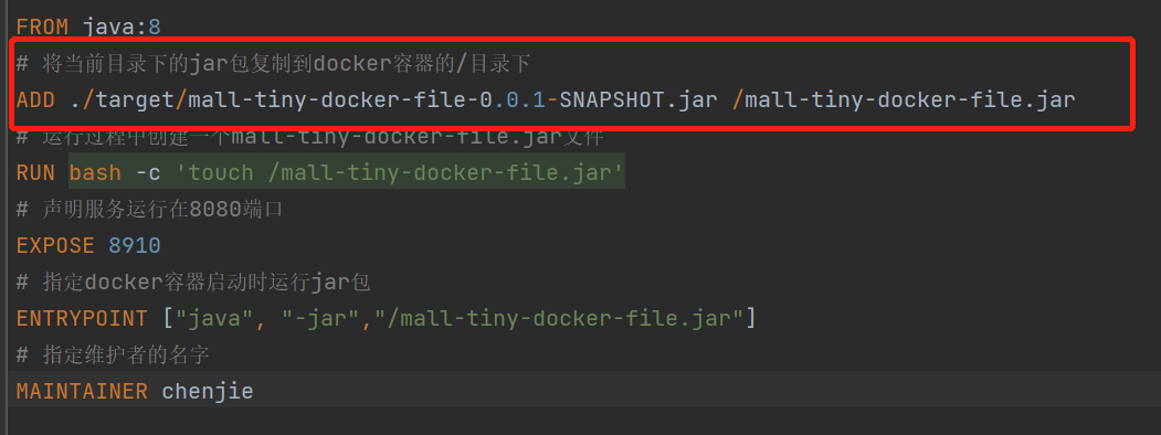 # 该镜像需要依赖的基础镜像 FROM java:8 # 将当前目录下的jar包复制到docker容器的/目录下 ADD ./target/mall-tiny-docker-file-0.0.1-SNAPSHOT.jar /mall-tiny-docker-file.jar # 运行过程中创建一个mall-tiny-docker-file.jar文件 RUN bash -c 'touch /mall-tiny-docker-file.jar' # 声明服务运行在8080端口 EXPOSE 8910 # 指定docker容器启动时运行jar包 ENTRYPOINT ["java", "-jar","/mall-tiny-docker-file.jar"] # 指定维护者的名字 MAINTAINER chenjie