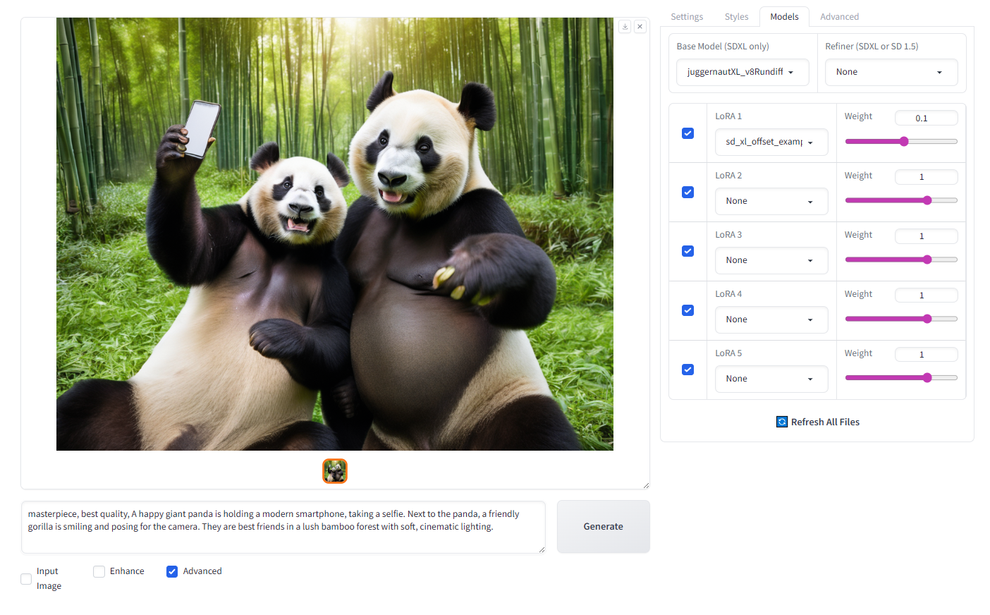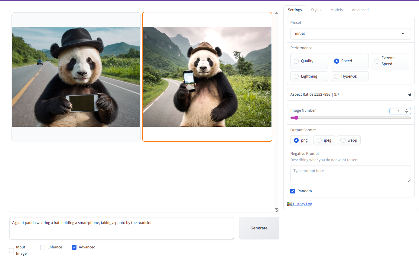 这里可以选择模型(切换模型会等待一段时间,加载新模型比较耗时)和样式,还有生成的风格。