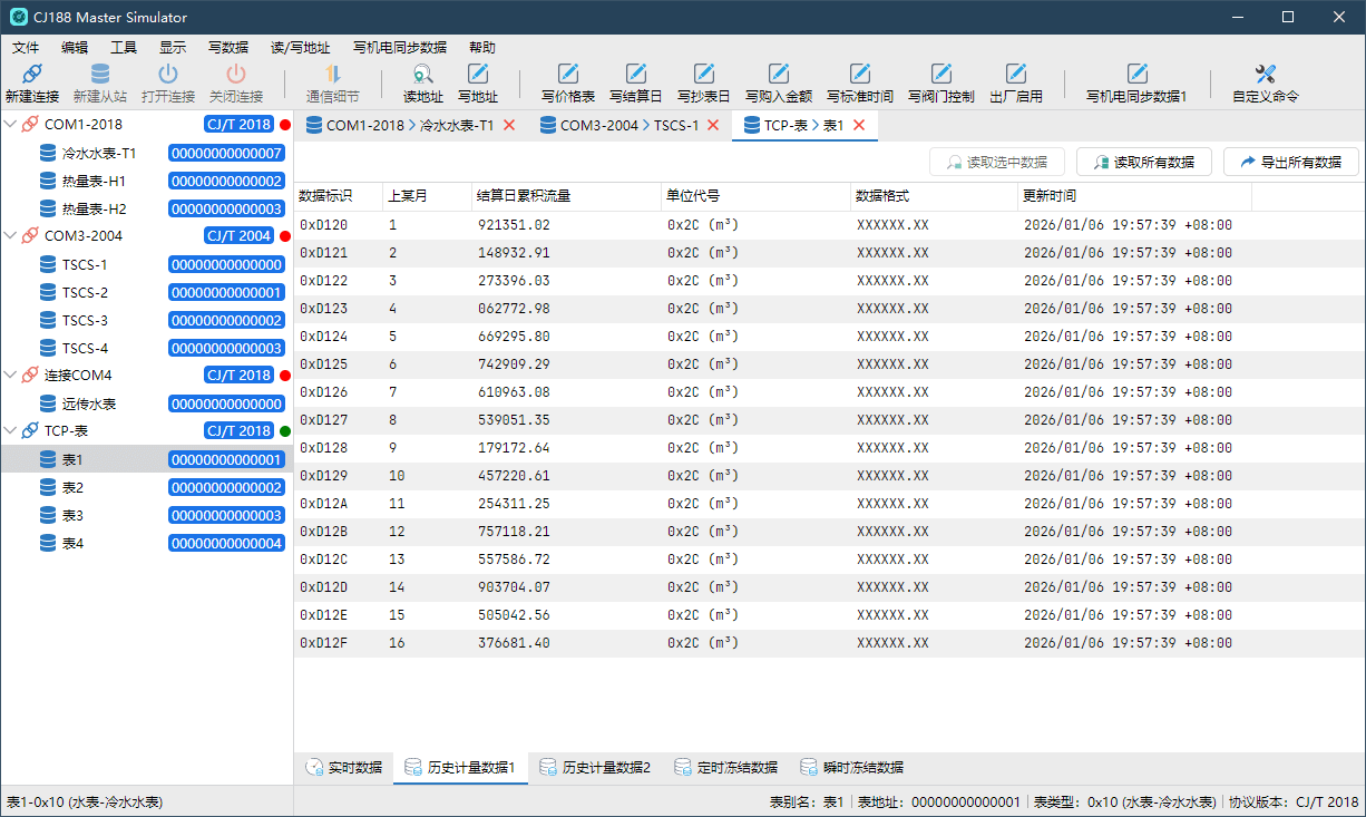 使用 CJ188 Master Simulator 快速读取计量数据、价格表、结算日、抄表日、购入金额、历史计量数据、历史冻结数据等。