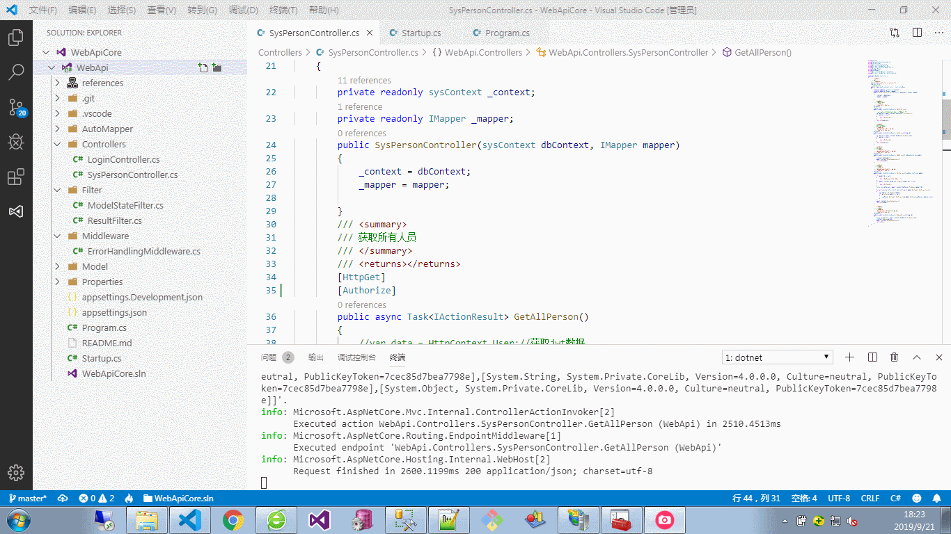 在开发的时候难免程序会出错,在.NetFramework上开发的时候也是用的过滤器进行拦截返回统一格式的model,并用log4net记录日志,同时给我发送QQ邮件(毕竟我的bug不能乱报>_<);.NetCore上用中间件来实现的,这里我是在stack overflow上看到国际友人这样实现的,后面我会加上邮件发送,具体代码