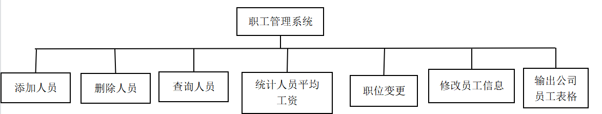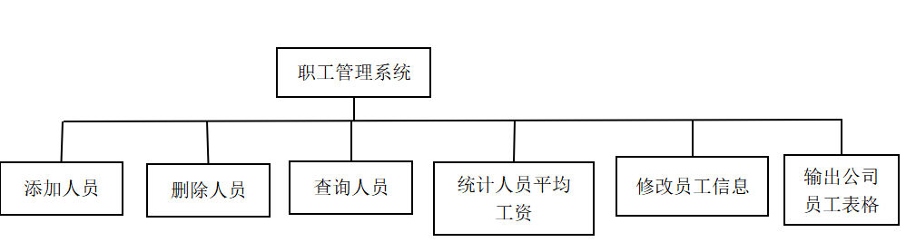 该项目软件来源于本人往学期的期末大作业。这个软件是一个职工管理系统,系统的功能上还是有一定的缺陷的。下面是系统还没修改的功能结构图。