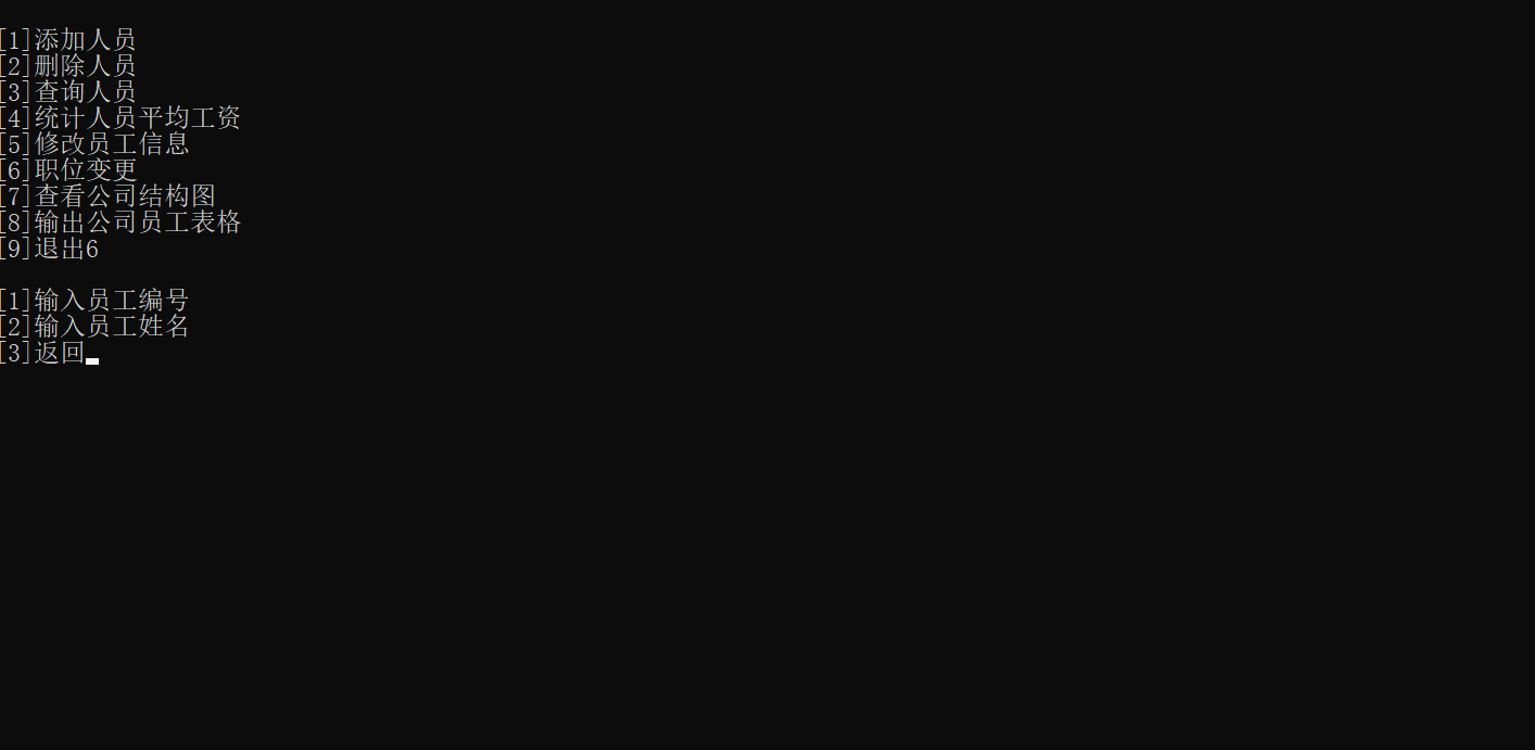 加上这个功能的最初,职位变更有些地方是有误的,比如把职员升职的时候,职位已满还是能升职,原因是没有限定每个职位的人数;或者是在写进文本文件的数据,读出会以乱码的形式打印,原因是没有使用二进制的方式写入文件。