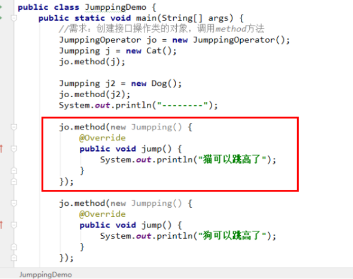 - 在启动类的main方法中,创建使用类对象,调用方法,传入匿名内部类