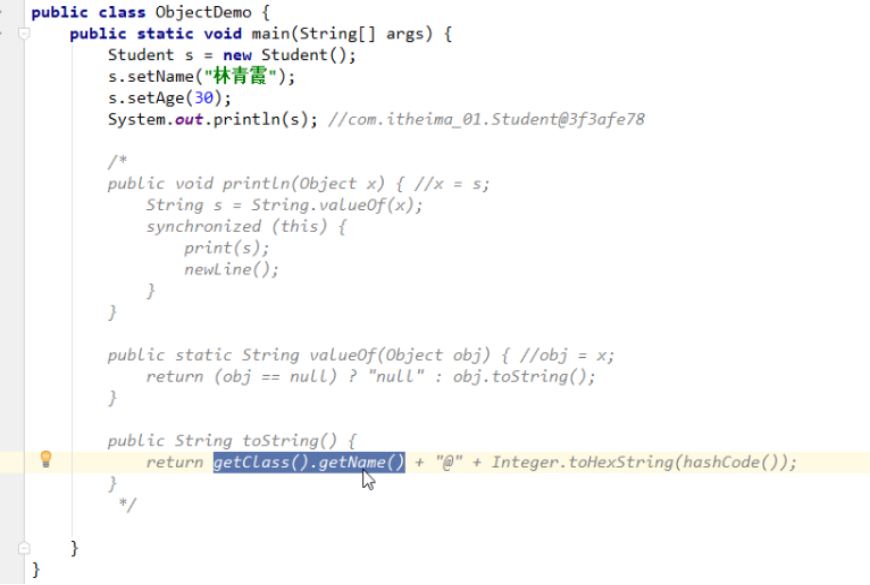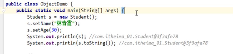 Object类的toString()方法:默认返回的是对象的地址值,一般没什么意义,我们一般会重写toString()返回对象成员变量的字符串形式,使用快捷键 alt+insert即可
