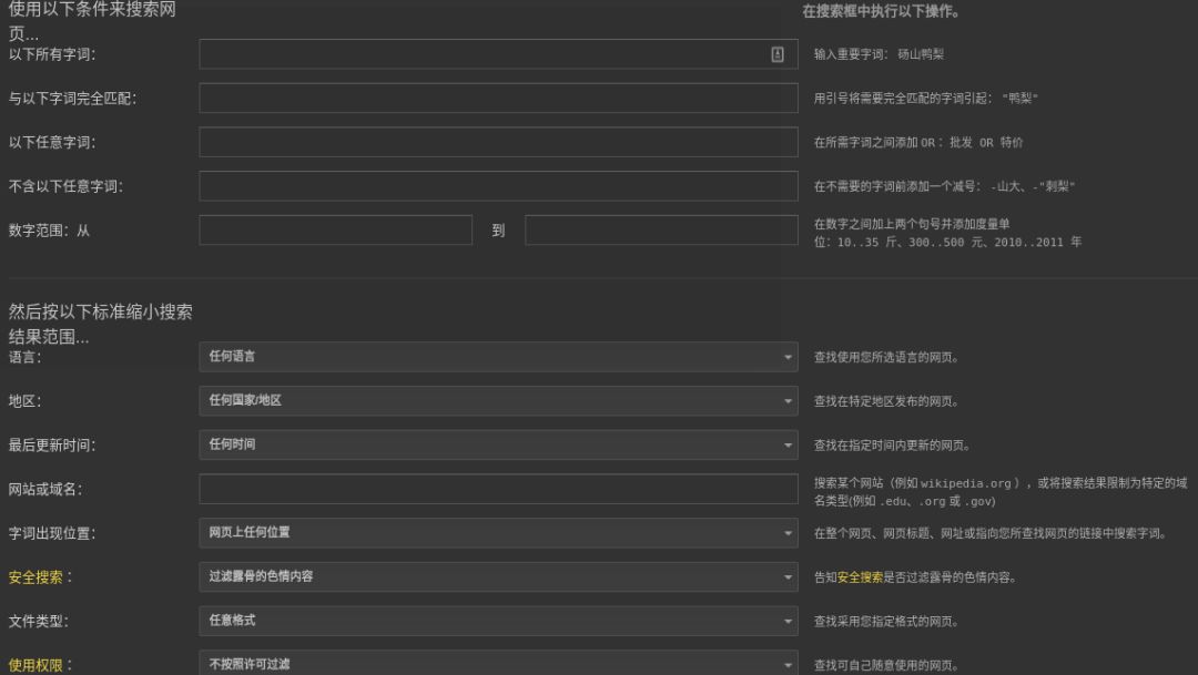 当然了,如果不想记这些麻烦的语法,完全可以使用各大搜索引擎自带的高级搜索,这里也可以设置很多的条件: