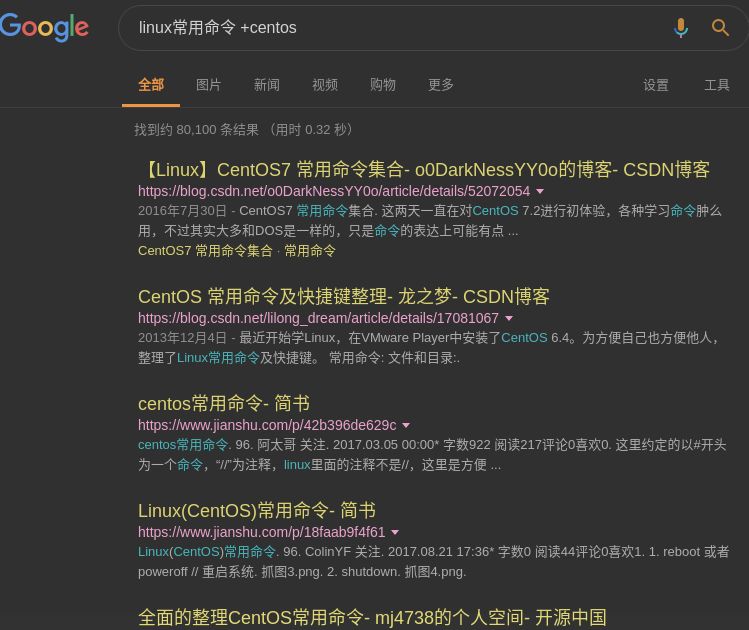 同样地,搜索结果中必须包含某个关键字时,可以使用+关键字。例如,搜索linux常用命令,且必须包含centos:
