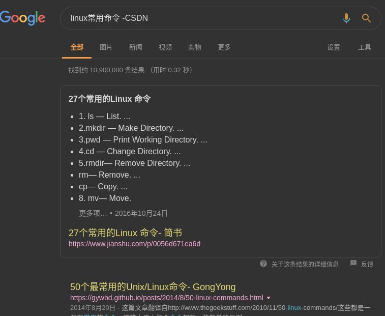 如果我们在搜索结果中不想看到某个关键字,可以使用-关键字。例如,搜索linux常用命令,但是不想搜索结果出现CSDN,可以使用下面的方式: