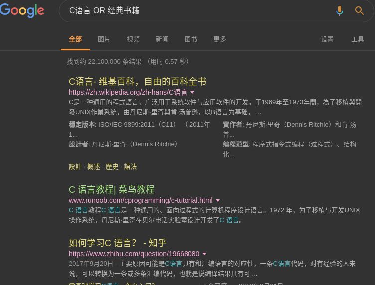 搜索结果会既包含C语言,又包含计算机经典书籍。而如果使用: