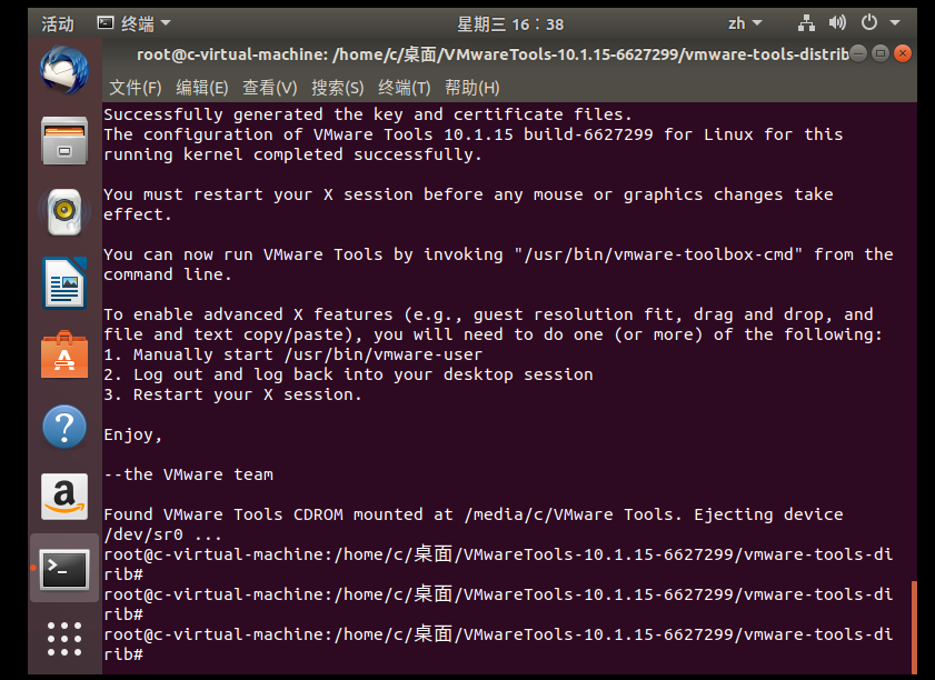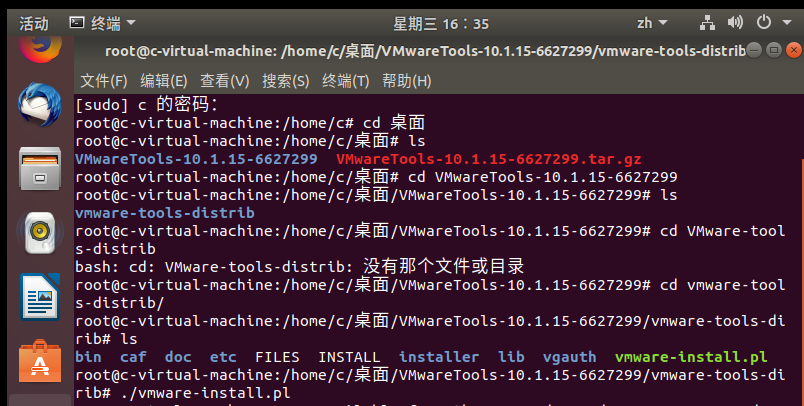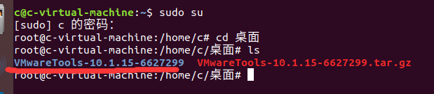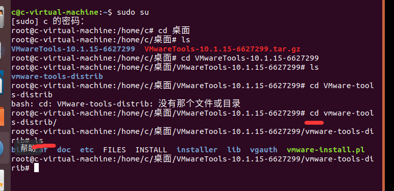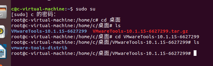 7.进入第一个文件夹,输入:cd VMwareTools-10.1.15-6627299;在该文件下,输入:ls;出现图中vmware-tools-distrib