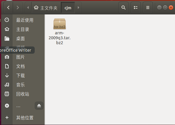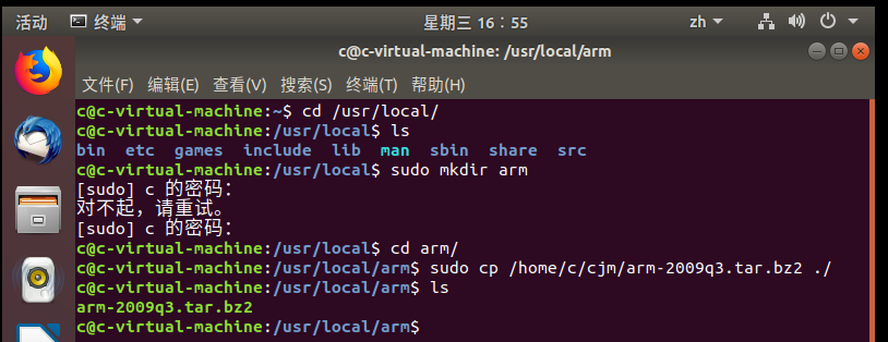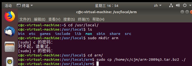 输入(以本人压缩包路径为例):sudo cp /home/c/cjm/arm-2009q3.tar.bz2./ (cp后面有空格) (具体自己压缩包存放的位置点文件的属性看)