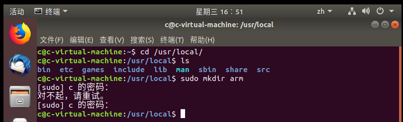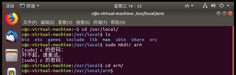 输入:sudo mkdir arm;它会提醒输入密码,密码输入时不会显示!