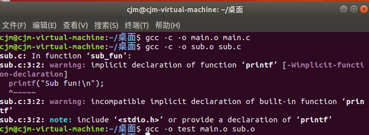 因为这两个文件还不是可执行文件,所以最后一步就是将它们连接为可执行文件test,在终端输入: