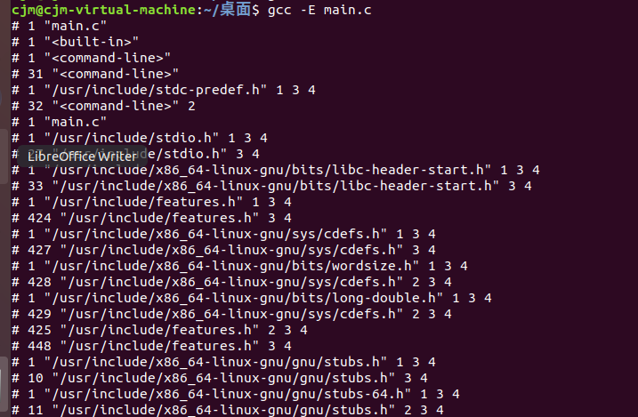 上述代码中的gcc总体选项-E表示,预处理后即停止,不进行编译,预处理后的代码送往标准输出。