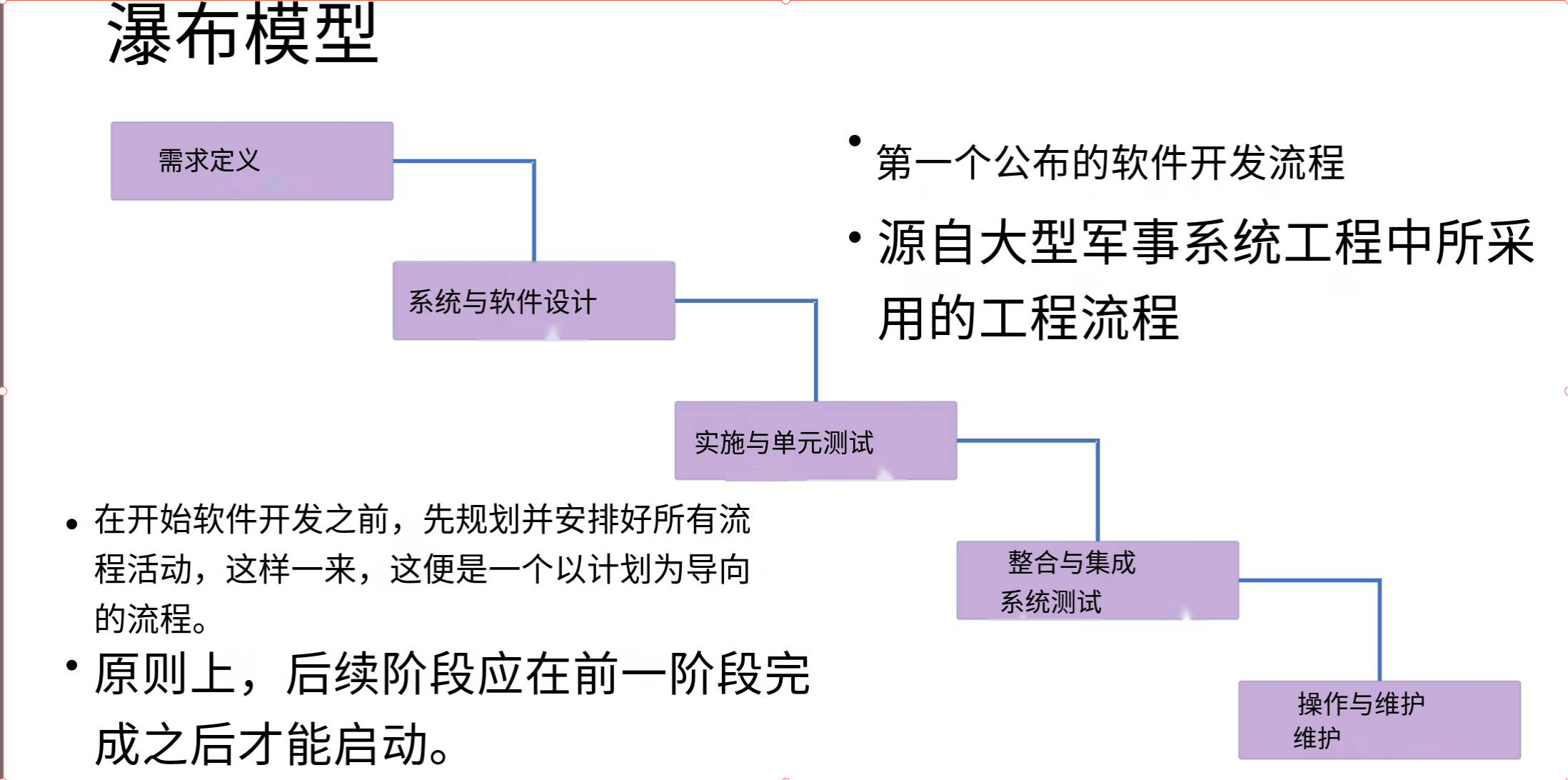 瀑布模型 (The Waterfall Model): 将基本活动表示为独立的过程阶段,包括需求规格说明、设计、实现、测试和维护。