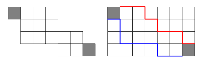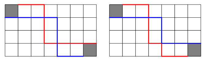 理解方式 1:LGV 引理。设起点 \(s_1 = (1, 2), s_2 = (2, 1)\),终点 \(e_1 = (n, m + 1), e_2 = (n + 1, m)\),设 \(\mathrm{calc}(s, e)\) 表示从点 \(s\) 到点 \(e\) 的方案数。