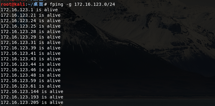 想要查看同一局域网内有几台设备可以使用fping,比如这台主机的IP为172.16.123.0,我们要查看局域网下还有哪些主机就要fping -g 172.16.123.0/24