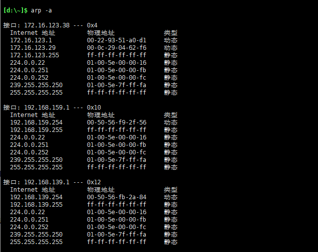 ARP缓存表中的条目类型有静态也有动态,静态ARP缓存条目是永久性的,动态ARP缓存条目如果主机在一段时间内不与此IP通信,将会删除对应条目,Windows默认的ARP缓存项存活时间为两分钟