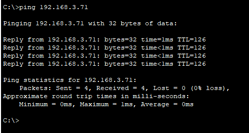在PC1,PING PC2,测试整条链路的连通性,截图如下: