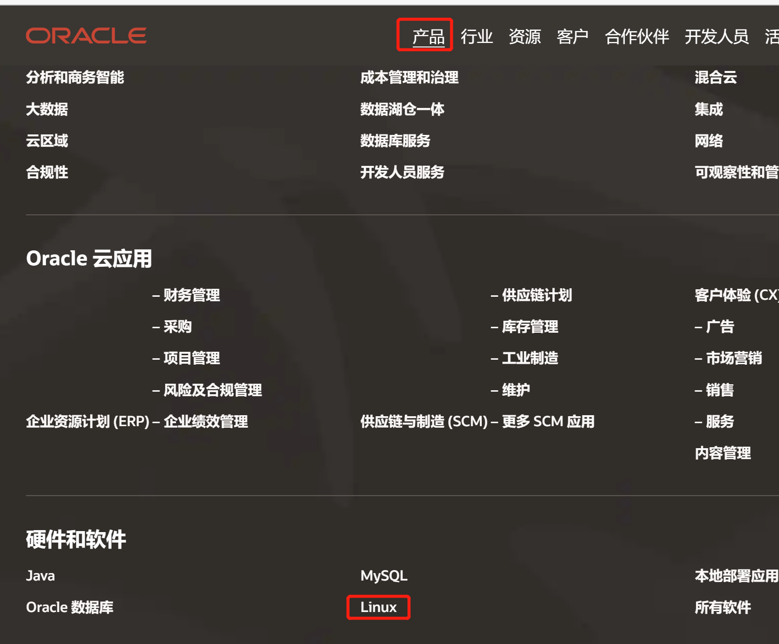 在官网(Oracle 甲骨文中国 | 云应用和云平台)上找到 产品下的Linux 点击。