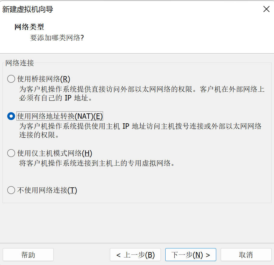 网络类型选择NAT模式,具体模式区别在后面配置时会有详细的介绍,下一步
