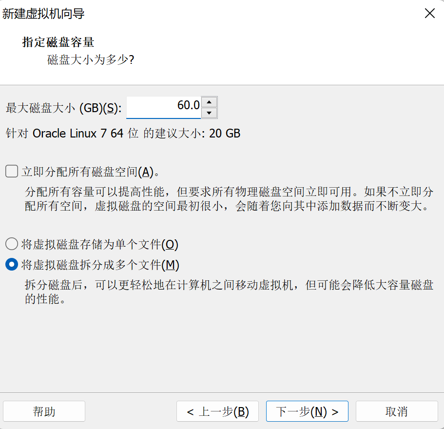 立即分配磁盘空间不要勾上,因为不勾上的话,不会立即分配60GB,会随我们使用的多少来分配.