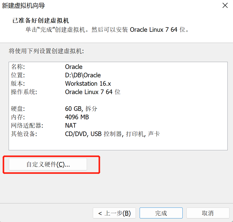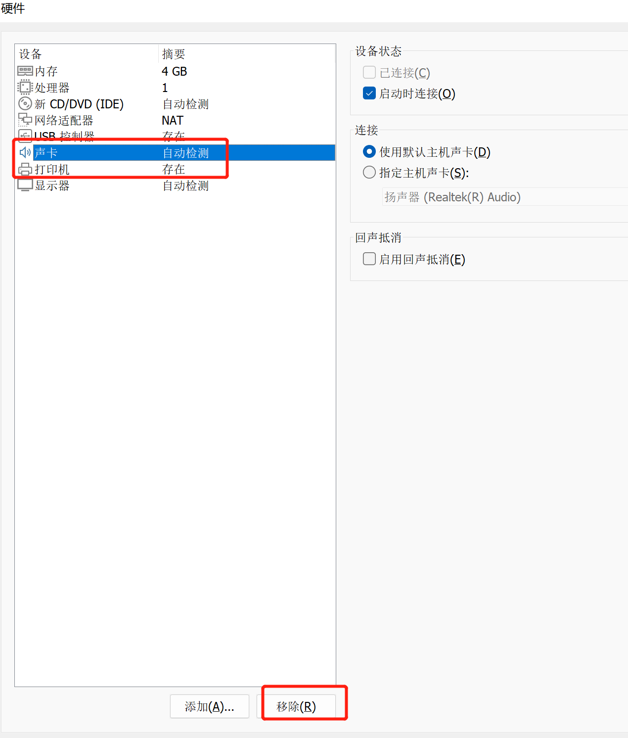 自定义硬件,我们可以根据需要来定义,比如我的虚拟机不需要声卡和打印机,可以移除它们。