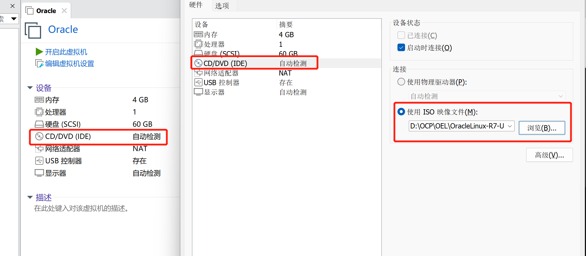 点击CD/DVD,选择使用ISO映像文件,映像文件地址为第一步下载的映像文件地址,点击确定。