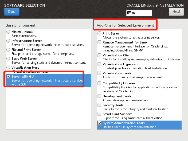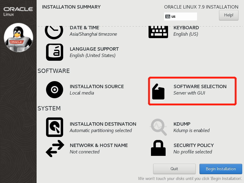 我们选择GUI图形界面安装,右侧的软件可以选择也可以不选择,如果需要,安装好系统后可以后续再安装