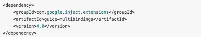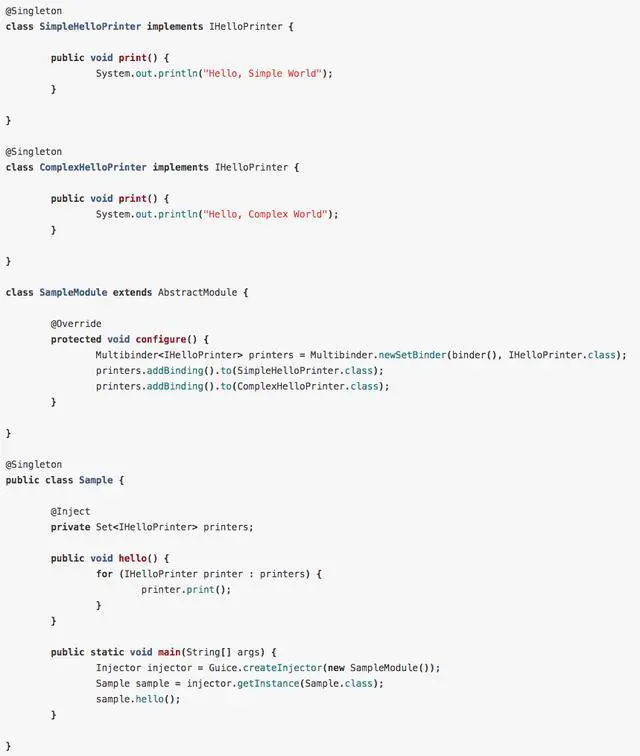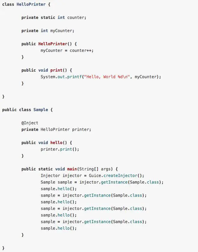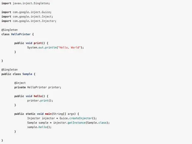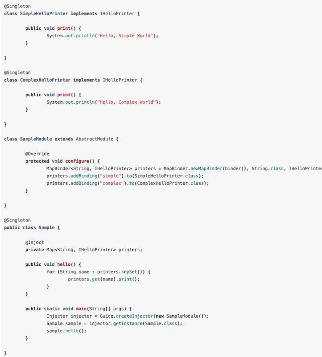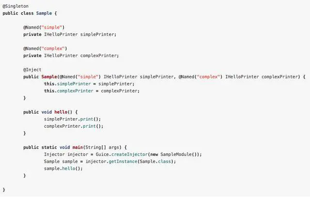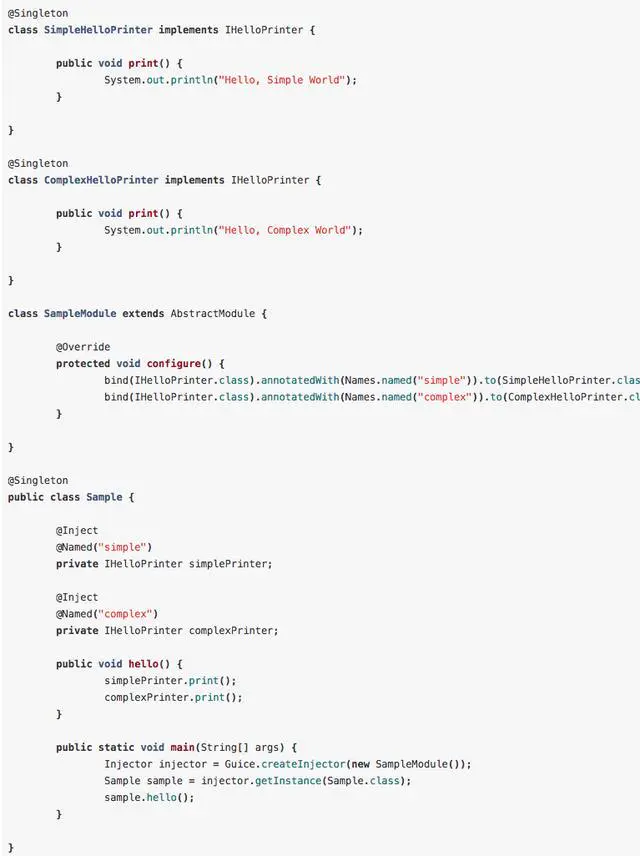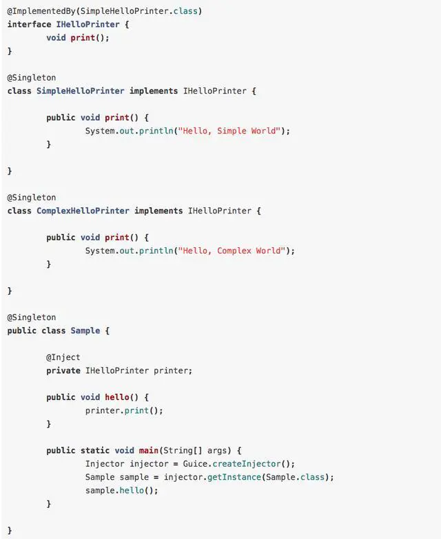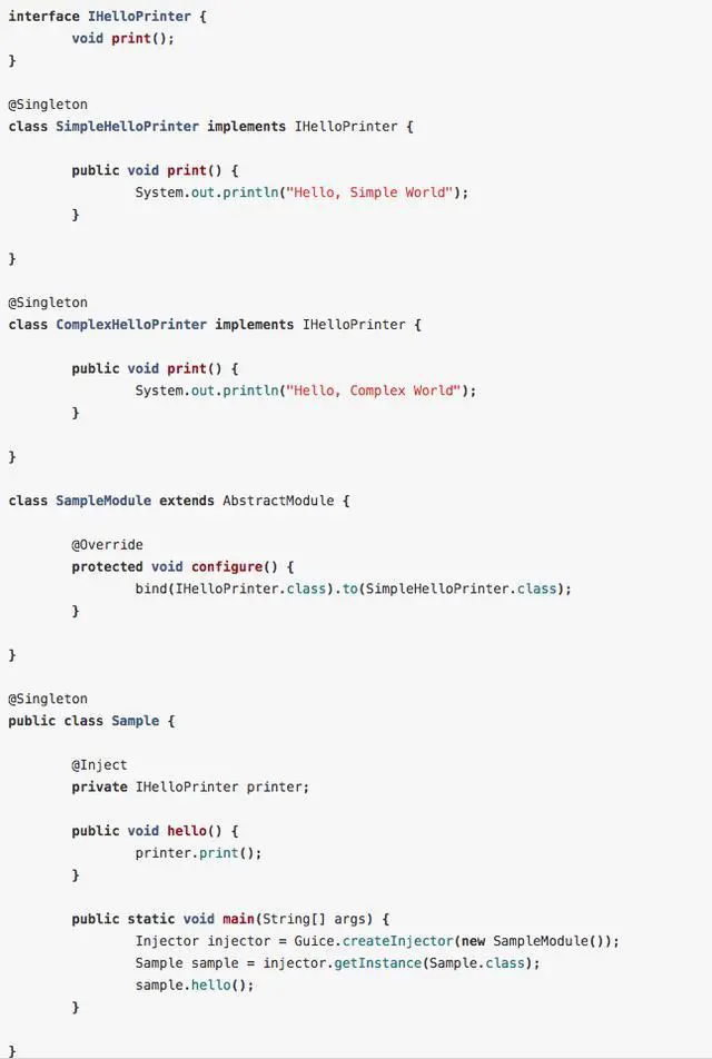 Guice里最常用的两个注解就是@Singleton和@Inject,Singleton表示构建的对象是单例的,Inject表示被标注的字段将使用Guice自动注入。在一般的项目中这两个注解一般可以完成90%以上的装配工作。