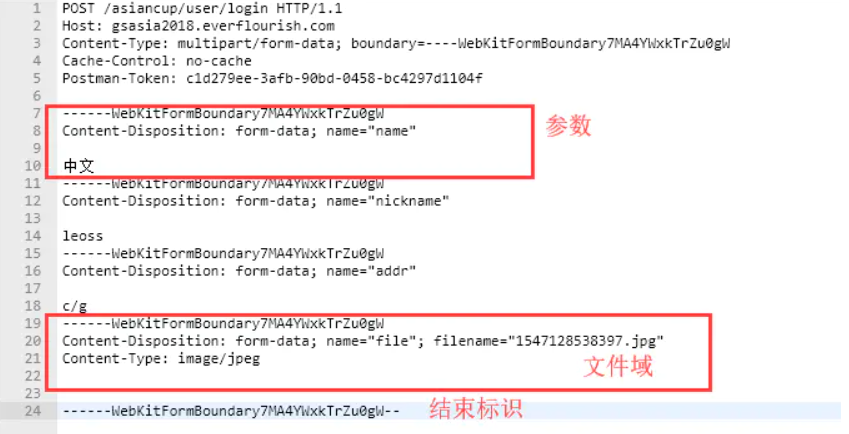 与application/x-www-form-urlencoded不同,这是一个多部分多媒体类型。首先生成了一个 boundary 用于分割不同的字段