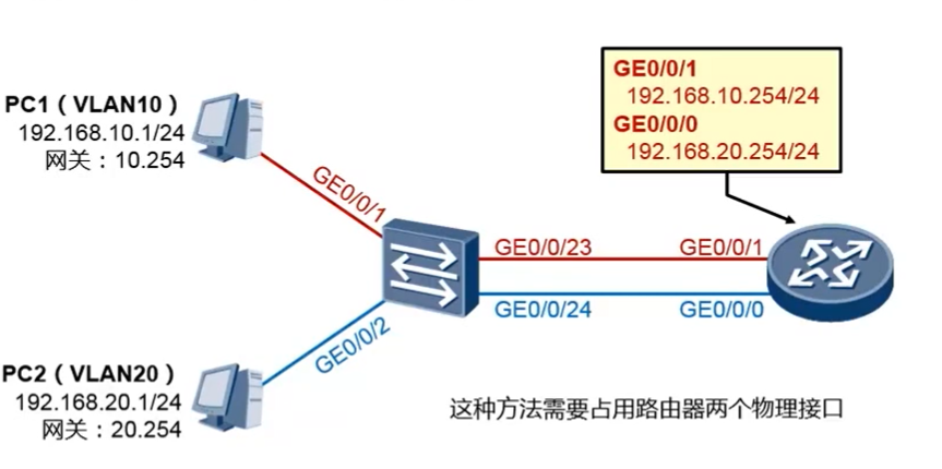 但是缺点是,每有一个vlan,就需要在路由器上面用一个端口来承载着vlan的流量,对路由器端口造成浪费。