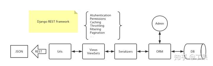 DRF是Django的超集,去掉了模板的部分,提供了一个REST的接口,同时也提供了满足该接口的代码工作流。同时,在REST的规范下,升级了权限和分页等功能,增加了限流和过滤搜索等功能。