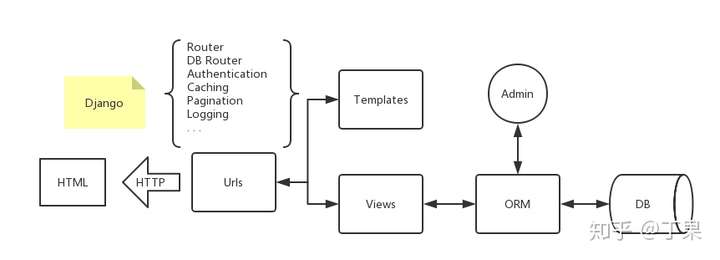 Django和DRF用了很久了,一直没有认真的总结一下,没什么总结比一张框图更暴力了。最近根据使用经验画了几张图,下面这两张图分别是Django的框图和Django REST Framwork的框图。