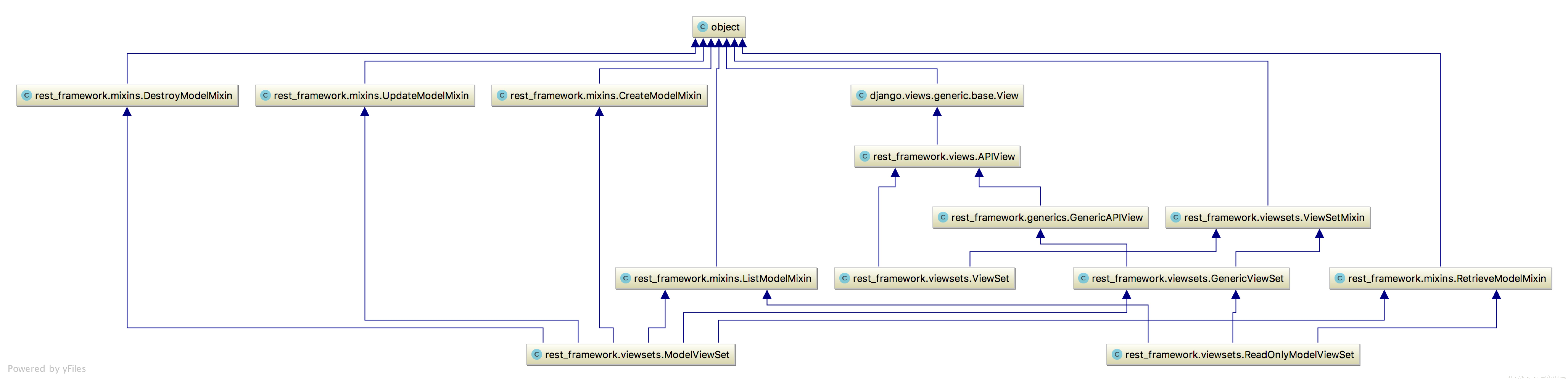 继承自GenericViewSet,同时包括了ListModelMixin、RetrieveModelMixin、CreateModelMixin、UpdateModelMixin、DestoryModelMixin。