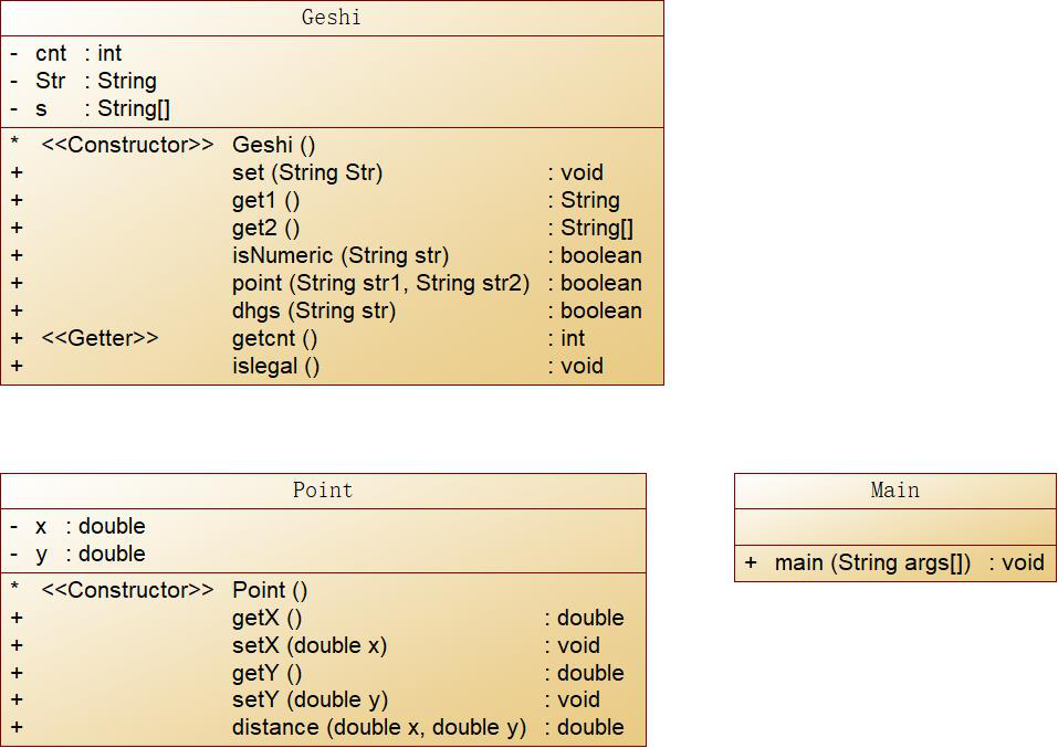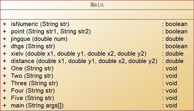第二题我的思路是定义一个输入一整行的变量,调用 String函数将空格前的字符串提取以及空格后的字符串提取,并讨论是否有逗号以及逗号的个数,若逗号个数并不等于题目要求输入点的个数并且空格数等于逗号数-1并且点输入都符合要求则为超过点的个数,若为输入点的个数个逗号则再讨论两边是否为double类型的数,用正则表达式判断,但是符号+-得单独判断,若满足,输出true,若不满足,则输出false,定义一个函数判断是否为一个点,再定义一个函数判断格式输入符不符合要求以及超出点的个数,再定义一个函数判断两条线段构成直线的位置关系,定义一个函数判断三个点是否在一条直线上,对于选项,用Switch和case进行筛选,现版本Java支持筛选字符串,然后将各个选项用split分离即可,然后分别定义函数做执行各选项的操作,定义函数在输入五个点的情况下是否为五边形,四边形,三角形,再定义一个一条直线与多边形的交点个数的函数,再定义一个算多边形面积的函数,定义一个是否为凹凸多边形的函数,其余我不会。所以无PowerDesigner相应类图。