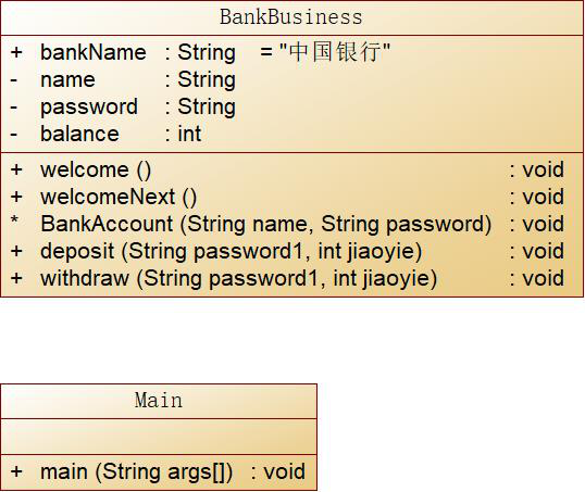 第三题我的思路是定义两个类,一个是主类,一个是BankBusiness类。在BankBusiness类中定义私有变量name,password和balance,然后在类里面添加获得私有属性以及返回私有属性的函数,以及题目要求的各个函数即可,主函数则是定义一个变量为BankBusiness类的一个对象,再定义多个输入输入变量,交替于执行操作之中即可。