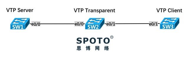 2. SW1为VTP Server模式,SW2为VTP Transparent模式,SW3为VTP Client模式,Domain名为 SPOTO, VTP密码为 P@s5w0rd ,使用VTP 版本2