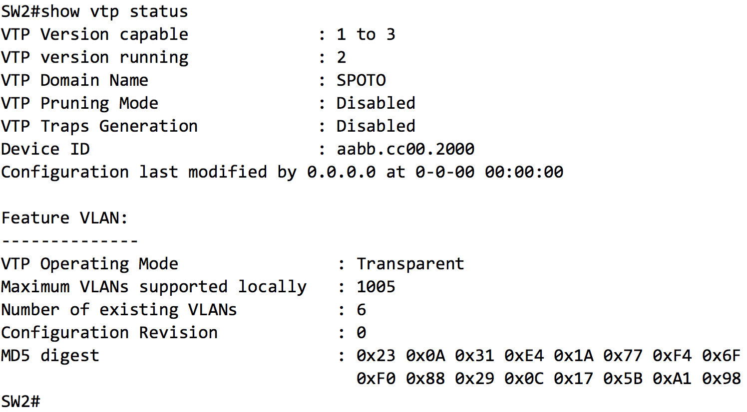 1 SW2(config)#vtp version 2 2 SW2(config)#vtp mode transparent 3 Setting device to VTP Transparent mode for VLANS. 4 SW2(config)#vtp domain SPOTO 5 Domain name already set to SPOTO. 6 SW2(config)#vtp password P@s5w0rd 7 Setting device VTP password to P@s5w0rd