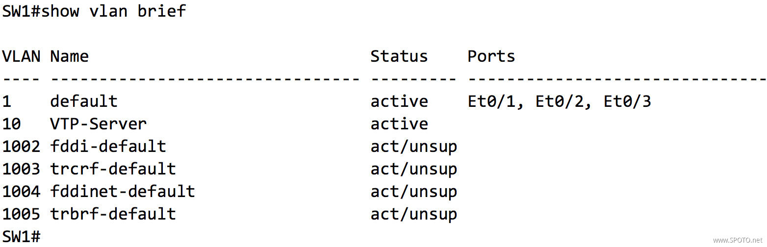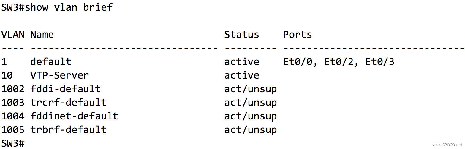SPOTO, VTP密码为P@s5w0rd - 在SW1上创建VLAN 10 名字为VTP-Server,在SW2上创建VLAN 20 名字为VTP-Transparent,观察SW1~3的VLAN数据库以及VTP状态
